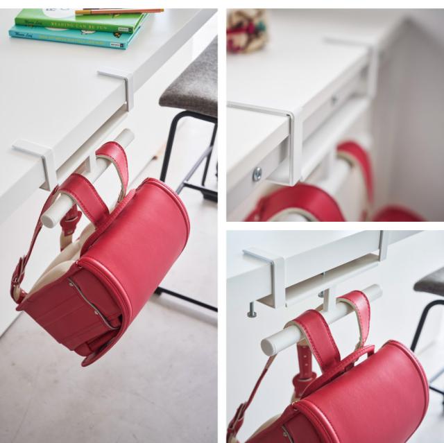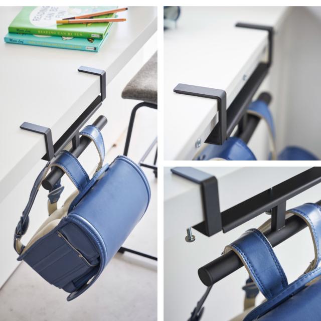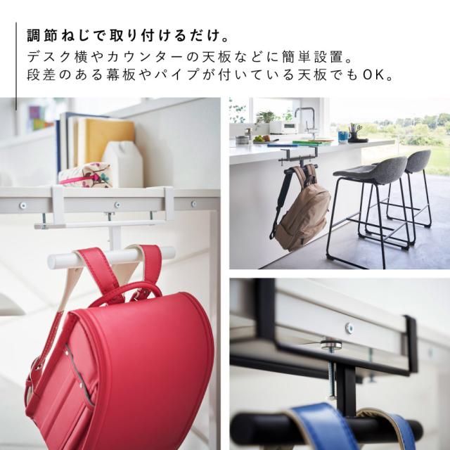 デスクやキッチンカウンターの天板に調節ネジでしっかりと取り付けできる便利なランドセル・リュック収納ハンガー。段差のある幕板やパイプが付いている天板にも調節ネジで取り付けられます。調節ネジで固定するので穴をあけずに設置できます。