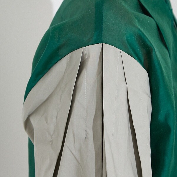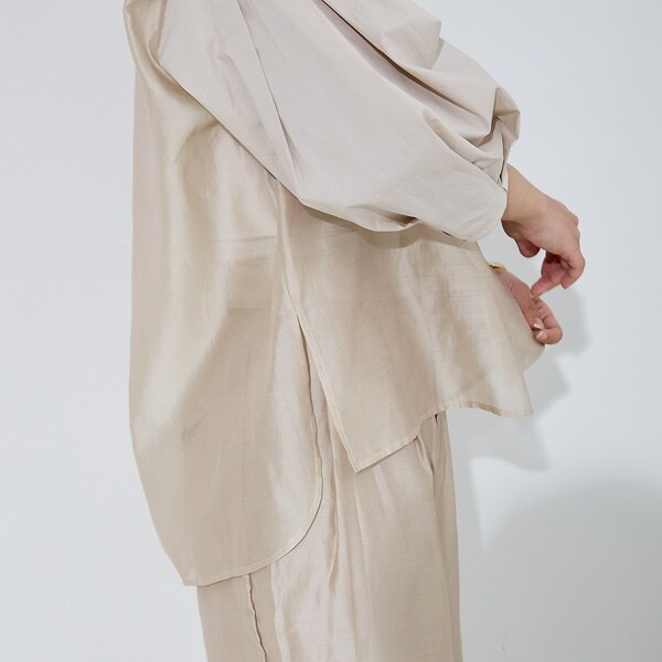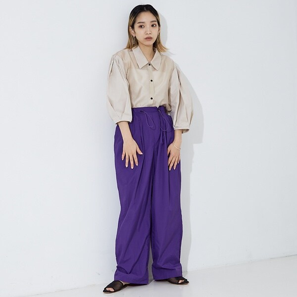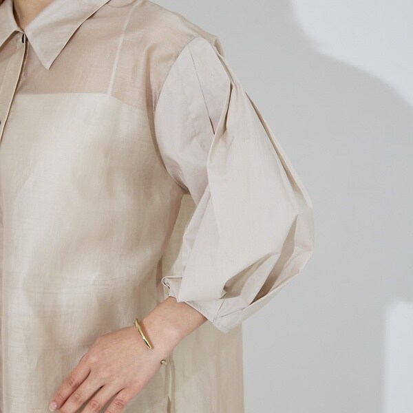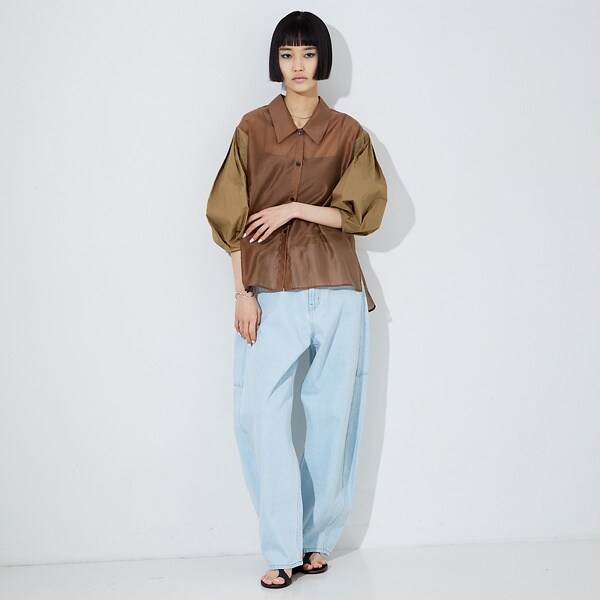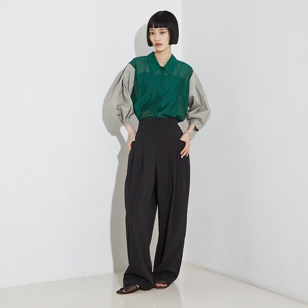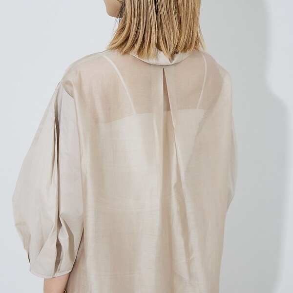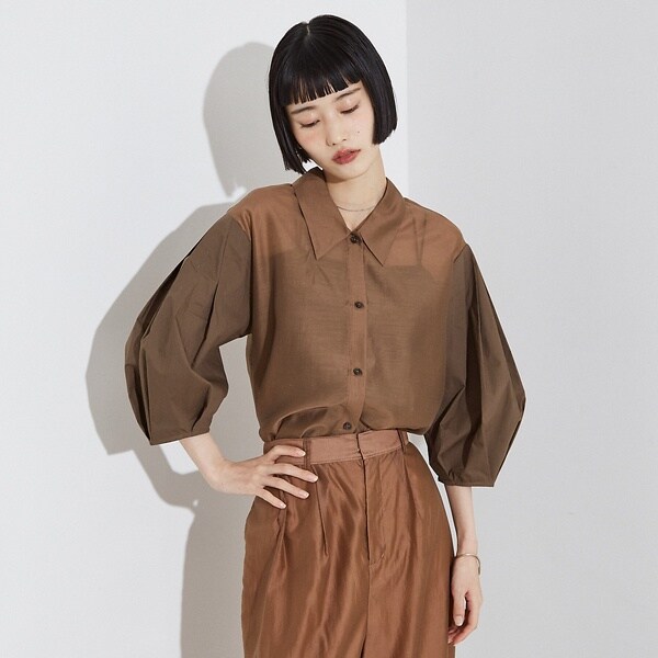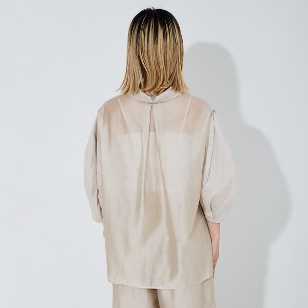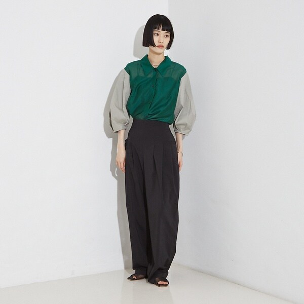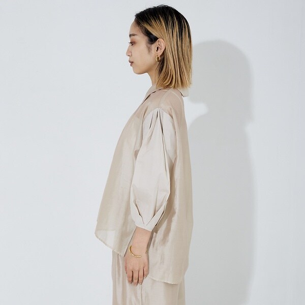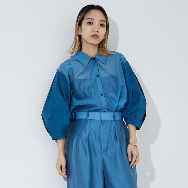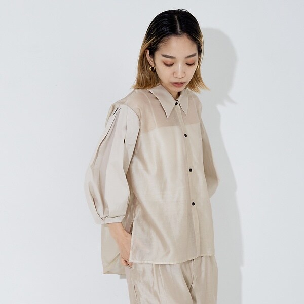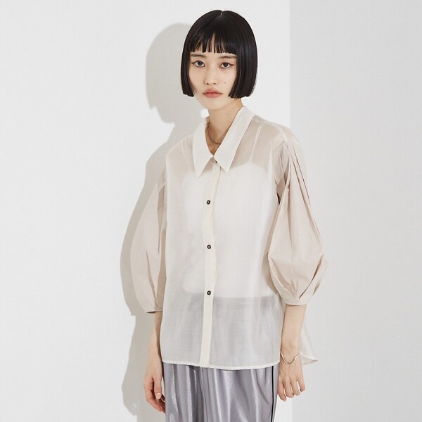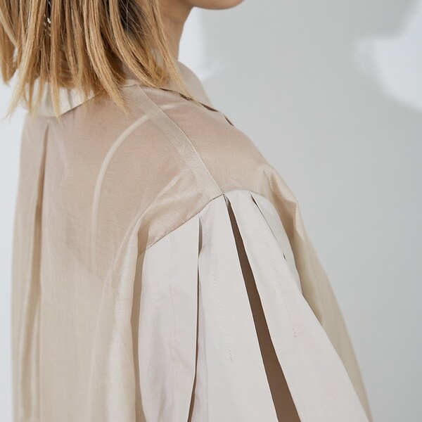 身頃の軽い印象と袖のタックによるボリューム感のメリハリがポイント。