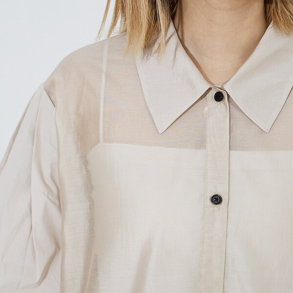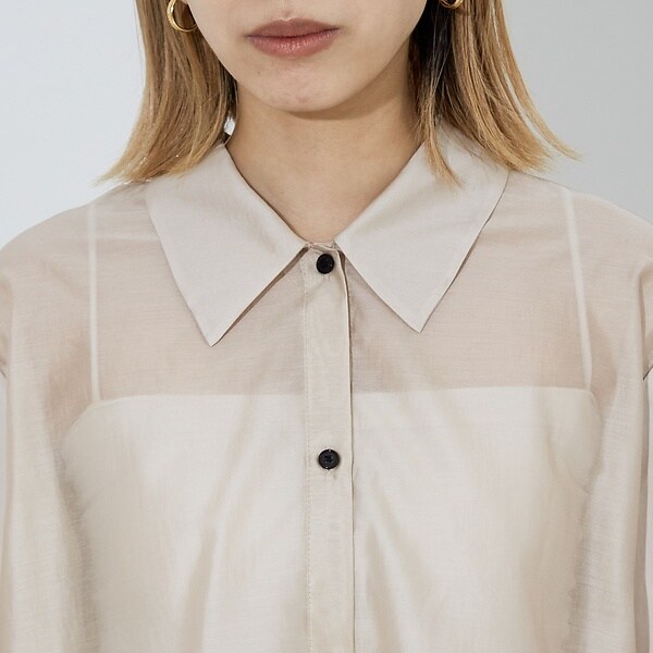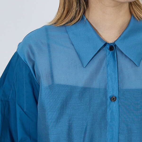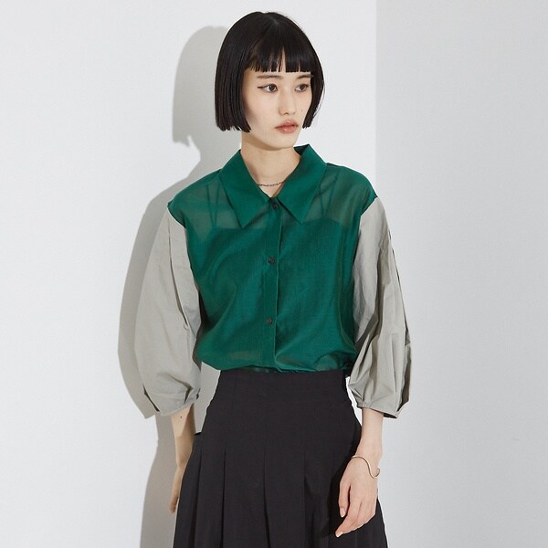 身頃がシアー素材×袖が透けないシャツ地のコンビになったデザイン半袖ブラウス。