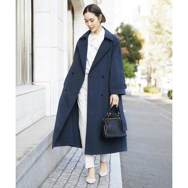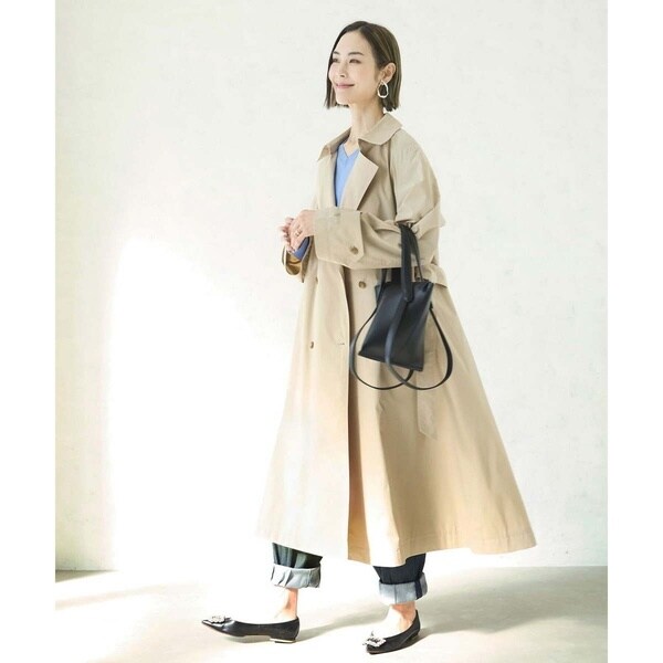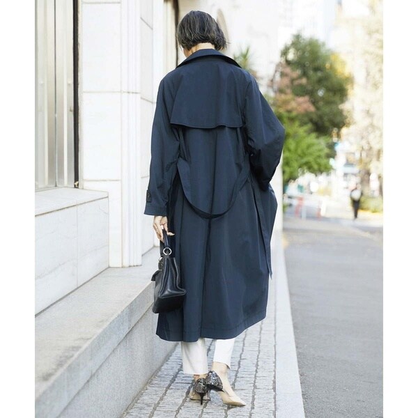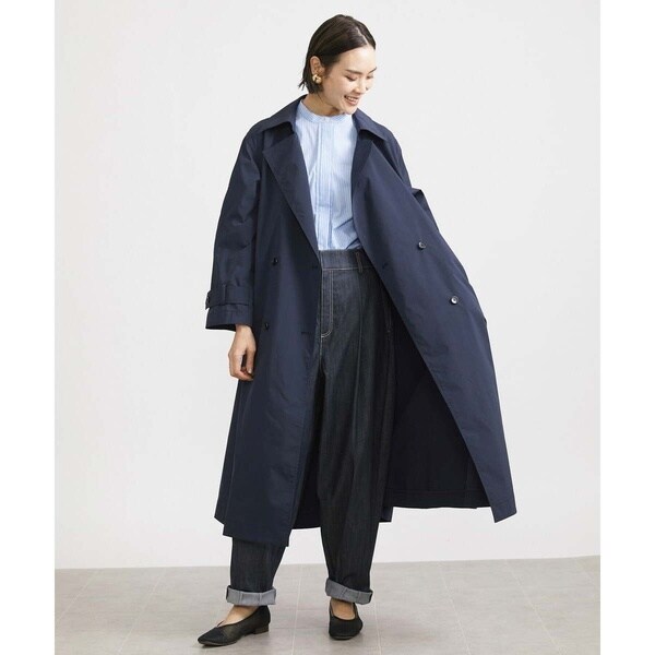 ジャケットの上からも着やすいゆったりとしたデザインです。お仕事着はもちろん、デニムスタイルなどのカジュアルなアイテムとも相性の良い1枚。馴染みの良い素材なので、厚手のニットはもちろん、カットソーと相性も良いトレンチコートです。