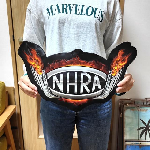 北米のドラッグレースの統括団体、NHRA(National Hot Rod Association)のロゴがデザインされたブリキ看板です。
