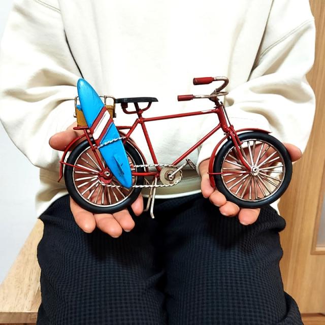 ビンテージ感があり、小型で可愛らしいサーフボードつき自転車の置物です。