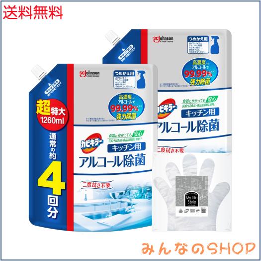 カビキラー アルコールスプレー キッチン用 詰め替え用 超特大 1260ml×2個 お掃除用手袋つき 日本製 アルコール除菌 除菌スプレー 除菌