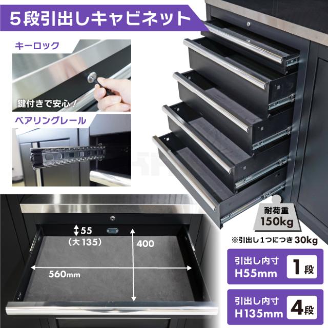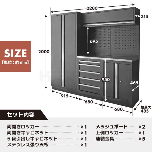 | セット内容(重量) | ・両開きロッカー(88kg)×1 ・両開きキャビネット(31.9kg)×1 ・5段引出しキャビネット(51.8kg)×1 ・天板(23kg)×1 ・メッシュボード(6.5kg)×2 ・上側ロッカー(19.5kg)×1 ・連結金具(1.5kg)×5 |