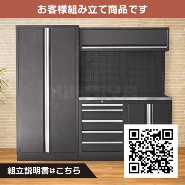●キャビネット、ロッカー、メッシュボードなどの大容量壁面収納セット ●黒色×ステンレスでガレージや事務所などをクールで清潔感のある空間に演出します ●木材の天板にはステンレスの薄板を被せており、丈夫で傷つきにくくなっております ●両開きロッカー、キャビネットの扉は約100度開きます 扉の上下にマグネットキャッチ付き ●両開きロッカー、キャビネットはそれぞれ可動式の棚板があります 両開きキャビネット内の棚板(1枚)は4段階でスペース区切り調整ができます 両開きロッカーの4枚の棚板は8段階(160mm間隔)の調整ができます ●5段引出しキャビネットは全段ベアリングレールを使用 ウレタンマットを敷いており、傷を防ぎます ●鍵付き(スペアキーあり)で両開きロッカー、キャビネットの扉や引出し全段を ロックすることも可能です ●上側ロッカーは、ガスダンパーでスムーズに開閉できます ●使い勝手のいいメッシュボードは、マグネット等で工具や文具を収納することが できます ●両開きロッカーやキャビネットの配置は、自由に変更できます ●KIKAIYAロゴステッカー付き ※商品は組立前の状態でお届けいたします ※組立、連結はお客様ご自身で、2〜3人で行ってください ※水平で安定した場所に設置してご使用ください 【関連商品】 ★L字フック 3個セット |