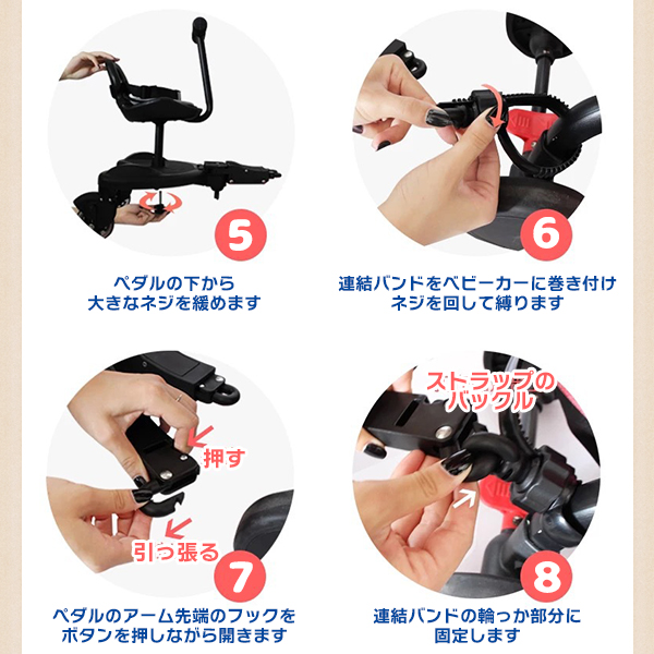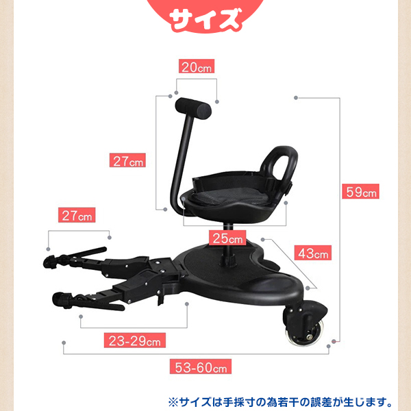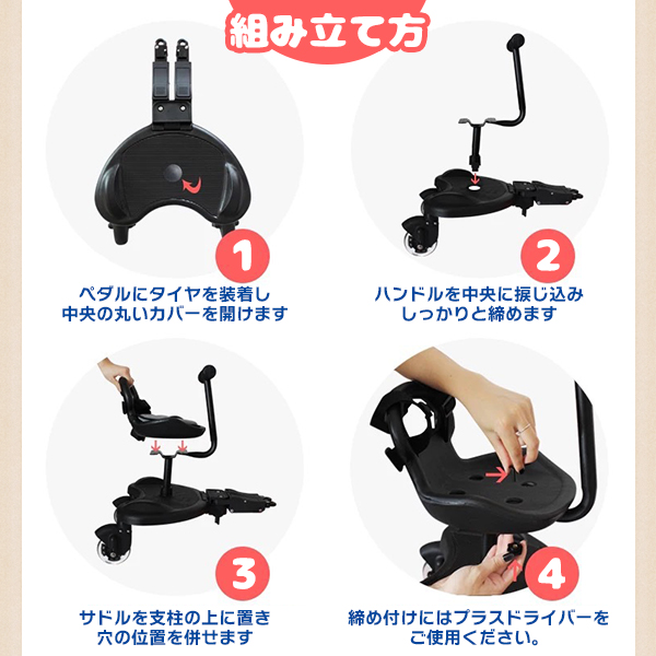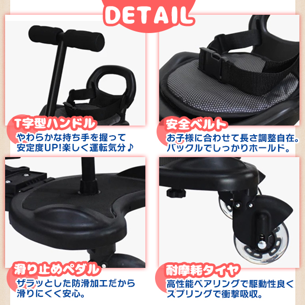 | 商品説明 | 【みんなで楽しくお出かけ!】 ベビーカーに取り付けるだけで、二人のお子様と仲良く快適にお出かけ! 重いダブルベビーカー不要で、一人の大人でもラクラク移動可能。 【ママと子供のリラックスタイム】 2WAY使用で、お子様の成長や好み似合わせて座ったり立ったり♪ ハンドルつきで運転手気分を味わい、シートを外せば立ち乗りも可能。 簡単な収納で、ベビーカーに掛けてしまえば片付けも簡単です。 【様々なベビーカーに対応】 連結バンドの調整で、様々なタイプのベビーカーにフィット。 お子さんが2歳から9歳まで利用でき、取り付けや取り外しも手軽です。 【家族の思い出を快適に】 お散歩やお買い物、公園、動物園、遊園地など、家族でのお出かけをより快適にサポート。 楽しい思い出作りをお手伝いします! |