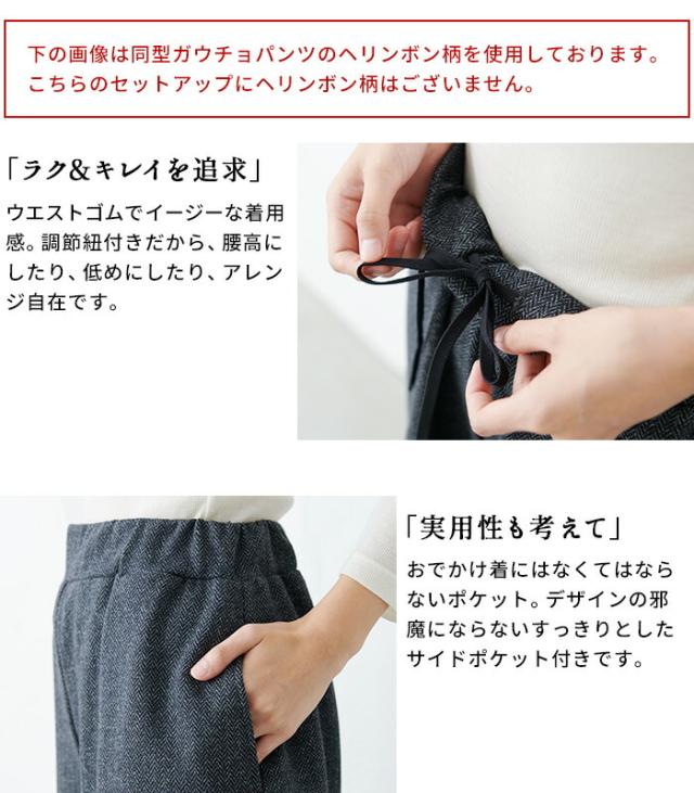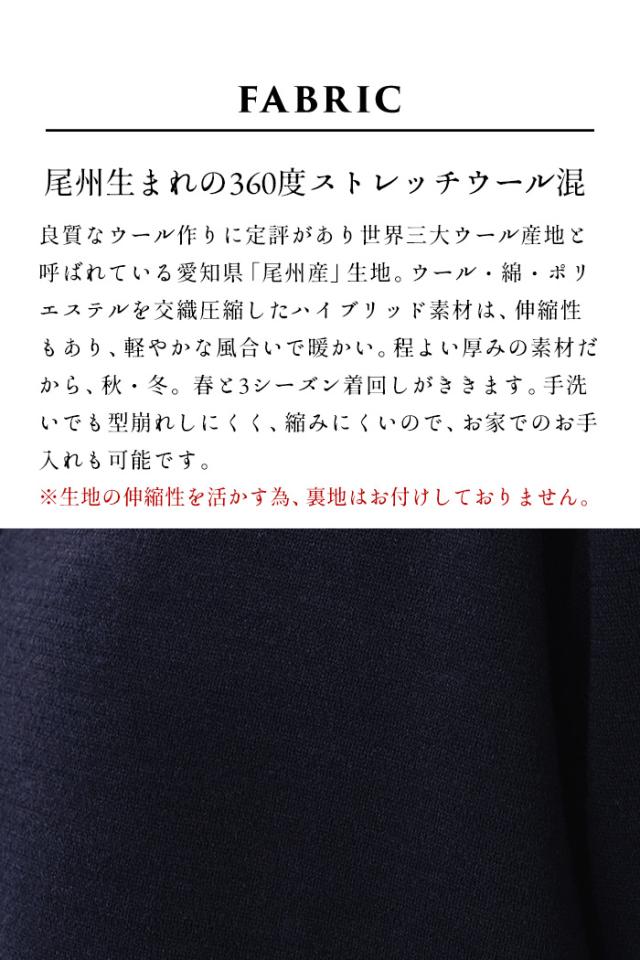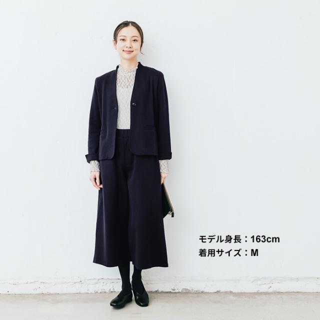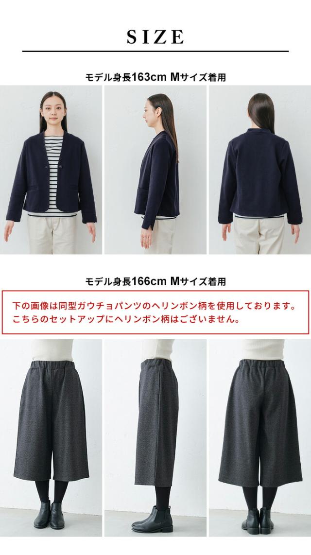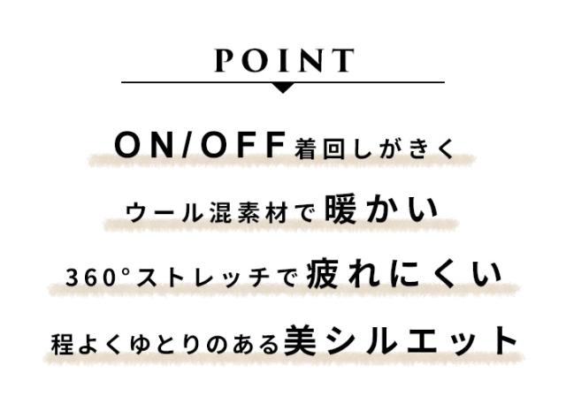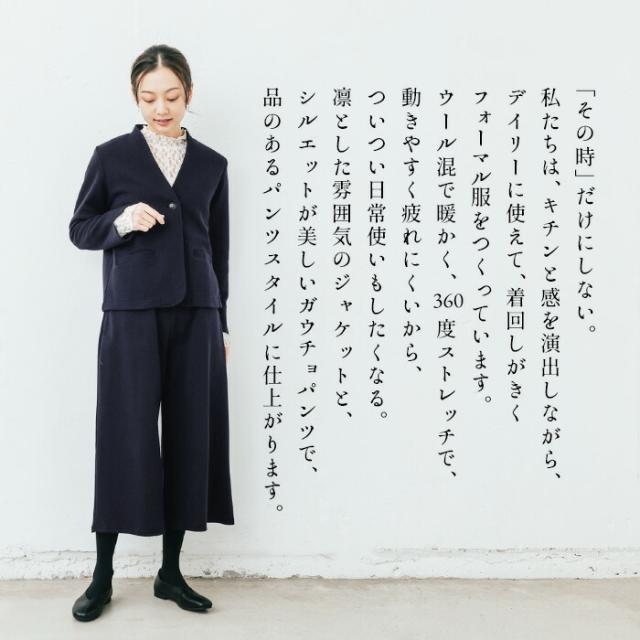 特徴 ON・OFF着まわせる。360度ストレッチで着心地ラクラクな、美形セットアップ。「その時」だけにしない。私たちは、キチンと感を演出しながら、デイリーに使えて、着回しがきくフォーマル服をつくっています。ウール混で暖かく、36度ストレッチで動きやすく疲れにくいから、ついつい日常使いもしたくなる。凛とした雰囲気のジャケットと、シルエットが美しいガウチョパンツで、品のあるパンツスタイルに仕上がります。