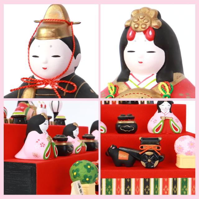 | 商品説明 | 三段の豪華さがありながらコンパクトなサイズ感も兼ね備えたかわいい雛人形。 女の子の健やかな成長と、末永い幸福を祈って飾る縁起物の雛人形です。 大切な家族の幸せを願う心温まる日本の伝統行事。思い出を彩る大切なワンシーンになります。 可愛らしいコンパクトサイズですので、飾り場所を悩むことなく毎年気軽に出すことができます。 手作りの陶磁器製の雛人形は品が有りそして表情も優しく穏やかで、親しみやすく飾りやすいサイズ感も人気です。 お部屋に可愛らしさをプラスしてくれる、インテリアのようなおしゃれなデザインのお雛様はどんなお部屋にも馴染みます。 手のひらに乗るようなコンパクトサイズですが、細工が細かく丁寧な仕上がりです。 懐かしいぬくもりもあり、一生楽しめる陶雛のお雛様をぜひ飾ってみてください。 心を込めた贈り物にもご自宅用にも好適です。 薬師窯(やくしがま)は、1074年以上の歴史あるやきものの街、愛知県瀬戸市の陶磁工房 中外陶園の窯名です。 明治以来瀬戸の地で伝承されてきたセトノベルティの技法により、干支置物や招き猫、雛人形、節句人形をはじめ、縁起物や四季折々の季節飾りなど現代の「和飾り」を提案する中外陶園の商品ブランドです。 温かみのある陶磁器のお雛様。 昔から続いている節句行事を大切にしながらも飾りやすく、場所を選ばない小さな陶磁器のお雛様です。 ひとつひとつ焼き物の良さを生かした手づくりの、手描きの雛人形。 お子様の健康と幸せを願って丁寧に作っています。 3月3日の雛祭りには雛人形を飾るご家庭が多いと思います。 いったいどういう意味があるのでしょうか?? 雛人形には厄災を人に変わって引き受ける役割があると言われています。 そのため女の子の健やかな成長や幸せを願い、日本の五節供のひとつ桃の節句3月3日に雛人形を飾るようになったそうです。 旧暦の3月3日が現在の4月上旬にあたり、ちょうど桃の花が開花する時期と重なったため、今日も桃の節句という美しい名で親しまれています。 雛祭りの語源はもともとは上流階級の中のあそび「ひいなあそび」であったとも言われていますが、現代の雛人形には、「何かあった時、雛人形が身代わりになってその子を災いからまもってくれますように」「生まれた子がすくすくと健康で優しい女性に育ちますように」と家族が子を想う気持ちが込められているのです。 |