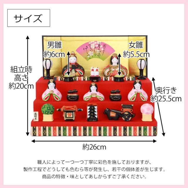 | サイズ(約) | 設置時サイズ:幅26cm×奥行き23cm×高さ20cm 男雛:高さ6cm 女雛:高さ5.5cm |