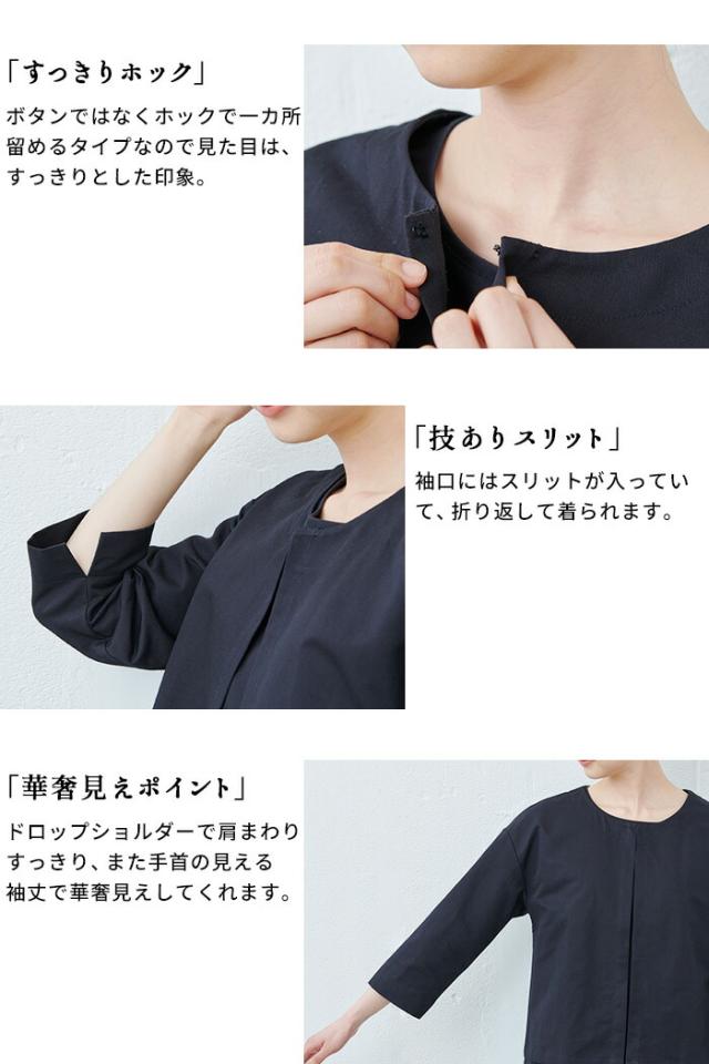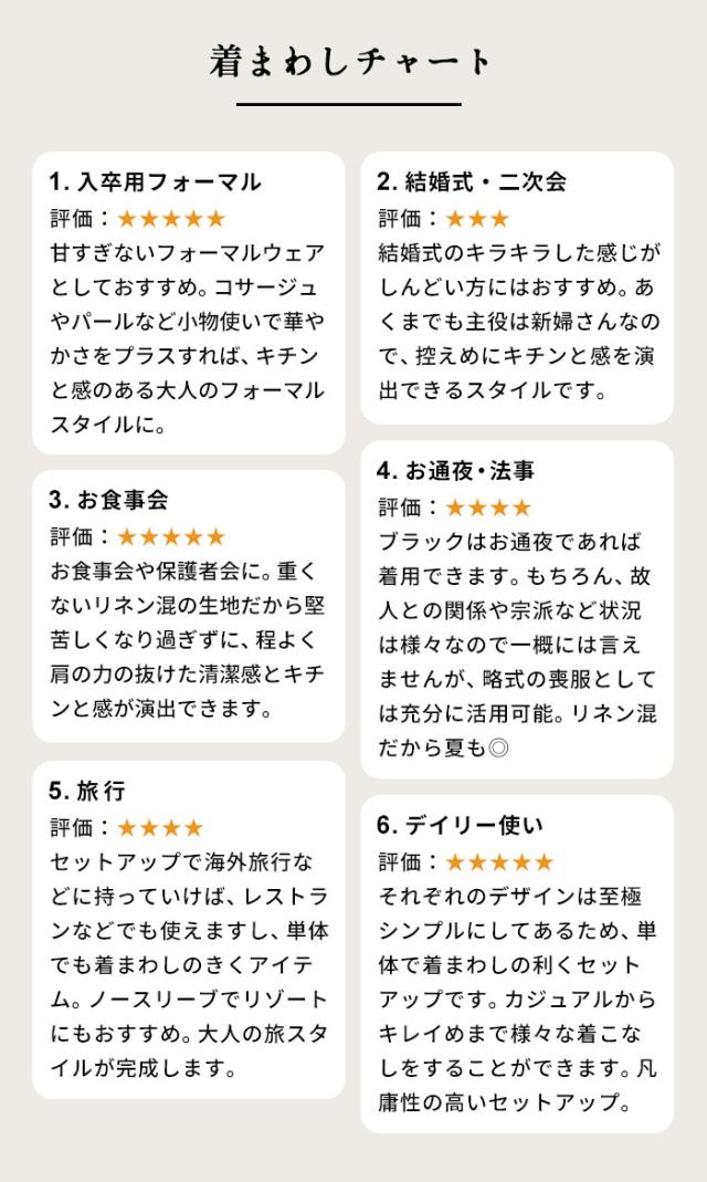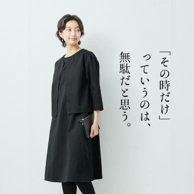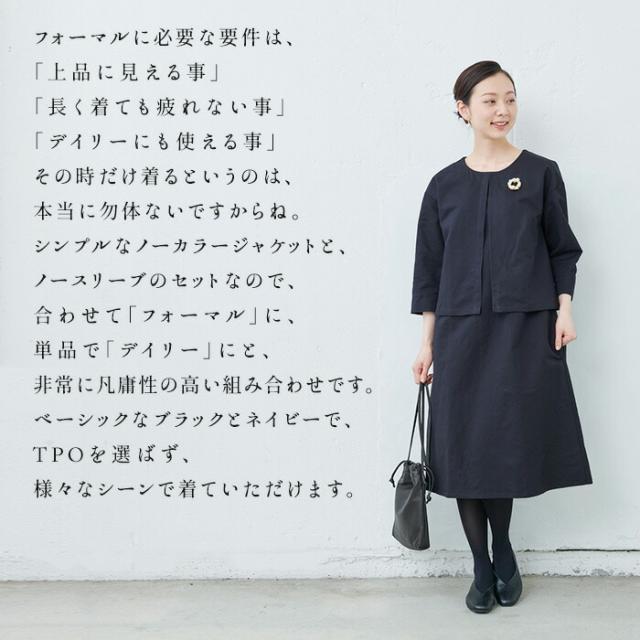 特徴 冠婚葬祭からデイリーまで使えるフランダースリネンコットンの上質セットアップ。当店のこだわりの「その時だけじゃない」フォーマルウェア。「上品に見える事」「長く着ても疲れない事」「デイリーにも使える事」TBではその3点に重きを置いています。その時だけ着るというのは、本当に勿体ないですからね。今回使用した生地はフランダースリネンとコットンのツイル素材です天然繊維とは思えない上品な光沢感。リネンなれではのサラッとした質感、コットンの柔らかさが融合した上質素材です。シンプルなノーカラージャケットとノースリーブのセットなので、合わせてフォーマルに、単品でデイリーにと、非常に汎用性が高い組み合わせですカラーはブラックだから、冠婚葬祭、TPOを選ばず様々なシーンに着ていただけます。