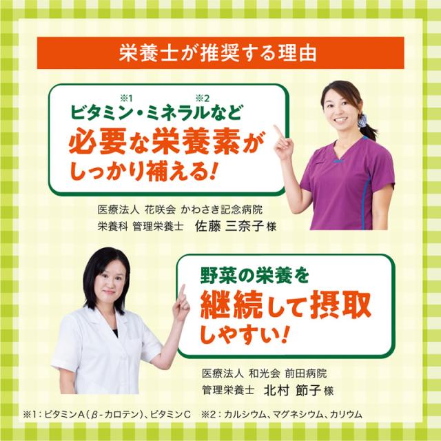 野菜汁(トマト、にんじん、赤ピーマン、きゅうり、インゲン豆、大根、ピーマン、メキャベツの葉、ケール、レタス、アスパラガス、カリフラワー、グリーンピース、冬瓜、緑豆スプラウト(もやし)、ブロッコリー、ゴーヤ、ごぼう、セロリ、モロヘイヤ、かぼちゃ、ヤーコン、あしたば、小松菜、パセリ、クレソン、キャベツ、ラディッシュ、ほうれん草、三つ葉)、レモン果汁、難消化性デキストリン、海藻カルシウム、鉄酵母、ライスマグネシウム/ビタミンC