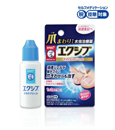 「メンソレータムエクシブWきわケアジェル」は爪ぎわに潜む水虫菌にまで抗真菌剤をスーッと浸透させることで見た目が気になる爪まわりの水虫を治療することを考えた水虫治療薬です。