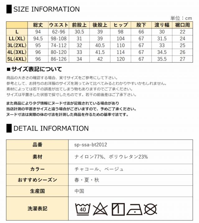 5L(4XL):総丈96 ウエスト86-126 前股上34 後股上42 ヒップ120 股下67 渡り幅35.5 裾口周27