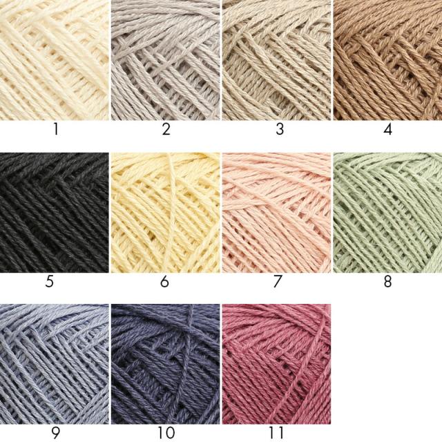 ・撚糸バランスを工夫することで編み地の斜行を起きにくくし、繊維の素抜けと毛羽立ちを抑えています。 ・1〜4番色は自然を感じさせるベーシックカラー、5〜10番色はトレンドのニュアンスカラーの10色展開です。 |