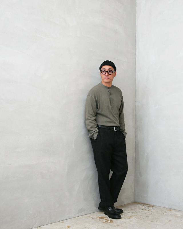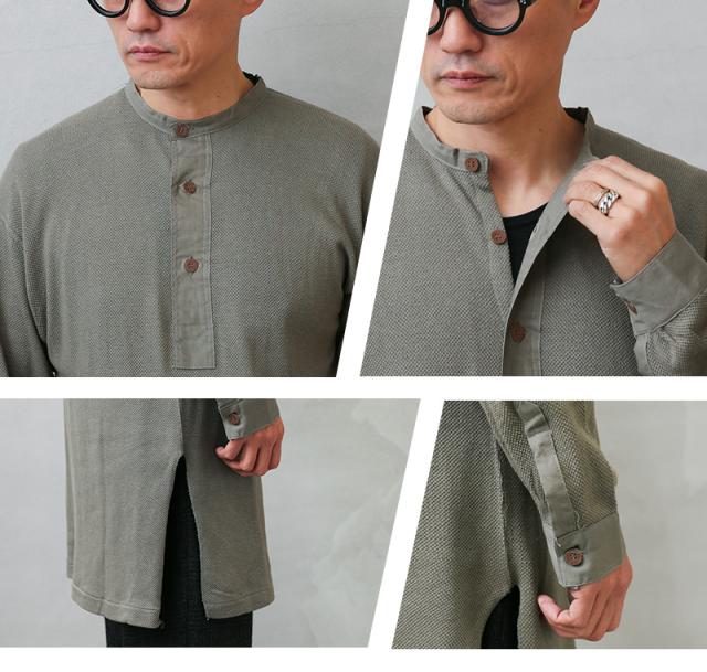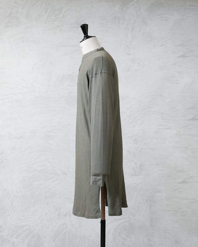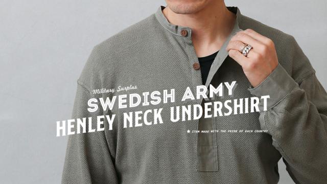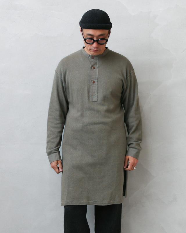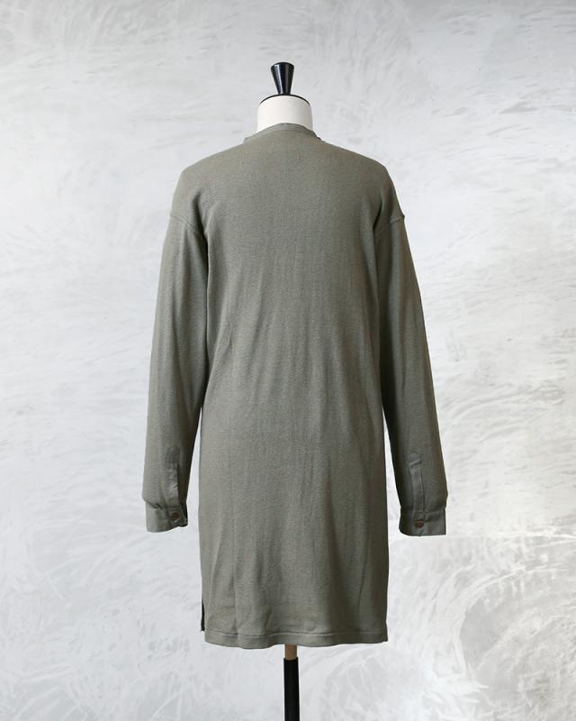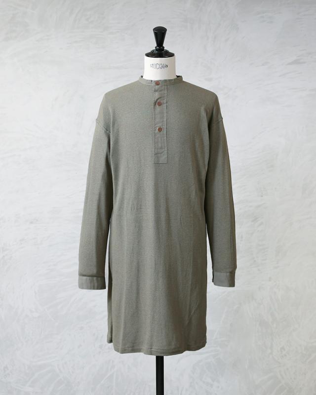 1939年から60年代頃に、スウェーデン軍で採用されていたスリーピングシャツです。体への接地面が少なく、さらりとした着心地のサーマル生地で、着丈はロング丈。 実際はパンツにインをして着用することを想定して作られたもので、パンツの中でもゴワつかないように、サイドに深めのスリットが入っています。太めの前立てと袖部分が布帛になっているのも実物らしいポイント。ヨーロッパビンテージ特有の風合いも相まって雰囲気のある一枚です。