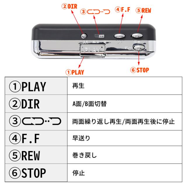 ボリューム調整や早送り/巻き戻し、A面/B面切替、両面繰り返し再生といった