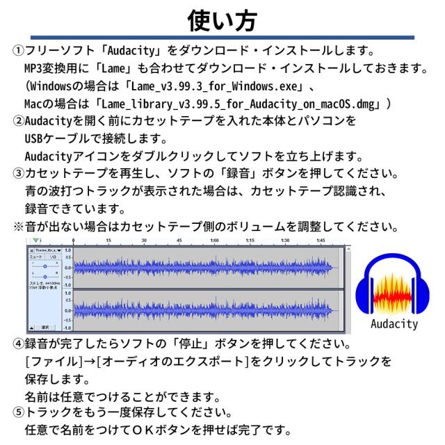 ※カセットテープ音源を保存・MP3変換するにはフリーソフト「Audacity」と「Lam.exe」が必要です。どちらもウェブサイトよりダウンロードできます。