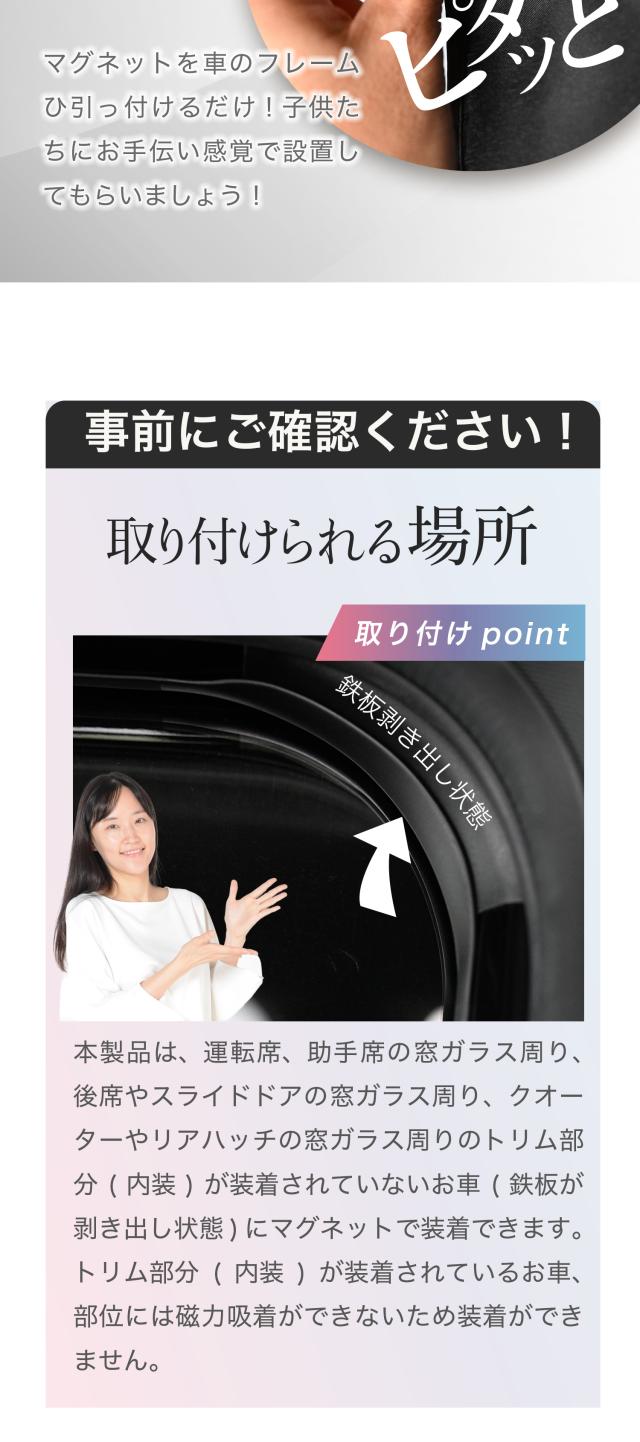 | ●商品名 マグネット式 ココカーテン ●セット内容 ・カーテン2枚 ●サイズ カーテン1枚:縦52cm×横90cm ●素材 カーテン:サテン風生地 【ご使用上の注意(重要)】 本製品は、強力なマグネットを使用しております。ご使用の際は以下の点にご注意ください。 ・一部の車両において、マグネットが長時間接触した塗装面(特に白系塗装)に変色や跡が残る場合がございます。 これは、車体塗装の性質や使用環境(温度、湿度、日射)によるものであり、製品の不具合によるものではありません。 ・特に高温になる車内や直射日光の当たる場所では、塗装の性質により化学的な反応が起こる可能性があるため、装着前に目立たない場所での試用をおすすめいたします。 ・ご不安な場合は、マグネットと塗装面の間に保護フィルムや布などを挟んでのご使用を推奨しております。 ・万が一、塗装面に変色・跡・その他の影響が生じた場合でも、当社では責任を負いかねますので、あらかじめご了承のうえご使用ください。 本製品の特性をご理解の上、ご購入・ご使用いただきますようお願い申し上げます。 【同業者への警告】 本製品は特許庁における意匠登録された知的財産権を有しております。本製品のコピー品、類似品を販売した場合、販売の中止と在庫の破棄、法的処置を講じます。同業者の転売も固くお断りします。 【販売条件の違い】 本製品は素材機能をメーカーのギャランディどうりご提供させていただくため、製造ロットを表題の末尾で管理しております。 各、商品ページにある表題末尾の数字が小さいほど生産された後、年数が経過している商品となります。 また、末尾の数字が大きいほど新しく生産された製品です。耐久性の目安としてお選びください。 【発行国】日本国特許庁(JP) 【公報種別】登録実用新案公報(U) 【登録番号】実用新案登録第3245406号(U3245406) 【登録日】令和6年1月17日(2024.1.17) 【発行日】令和6年1月25日(2024.1.25) 【考案の名称】自動車用カーテン 【出願番号】実願2023-4281(U2023-4281) 【出願日】令和5年11月29日(2023.11.29) 【実用新案権者】 【識別番号】509321240 【氏名又は名称】株式会社ハイヤー 【代理人】 【識別番号】100109472 【弁理士】 【氏名又は名称】森本 直之 【要約】 【課題】開閉操作が行いやすいマグネット式の自動車用カーテンを提供する。 【解決手段】カーテン生地10と、上記カーテン生地10を車窓30が隠れるように取り付けるための複数のマグネット20とを備え、上記マグネット20が、上記カーテン生地10の上辺に沿って一定間隔を隔ててそれぞれ縫い込まれており、上記マグネット20は、直径よりも高さが低い円柱状を呈している。上記各マグネット20を車窓30の上辺に沿ってボディに吸着させることで、カーテン生地10で車窓30を覆うカーテンとして使用することができる。また、マグネット20が直径よりも高さが低い円柱状で吸着面積が小さいため、マグネット20の吸着状態を維持したまま左右にスライドさせることが可能で、カーテン生地10の開閉操作が行いやすい。 ![]() |