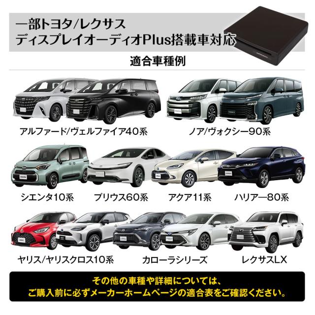 アルファード/ヴェルファイア40系、ノア/ヴォクシー90系、シエンタ10系、プリウス60系、アクア11系、ハリアー80系、ヤリス/ヤリスクロス10系、カローラシリーズ、クラウンシリーズ、ハイエース、RAV4、ランドクルーザー、レクサスLX/RXなど、トヨタ/レクサスのディスプレイオーディオPlus搭載車に対応。