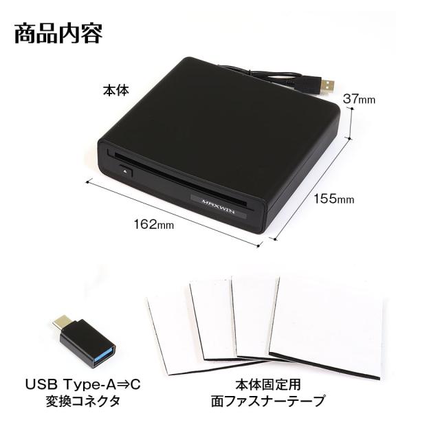 本体は振動に強く、縦置き・横置きどちらにも対応。USB接続ケーブルは約55cmの長さがあり設置場所に困りません。車種によってはコンソールボックス内にも設置できます。ディスクを出し入れしやすいスロットインタイプ採用。 - 簡単接続