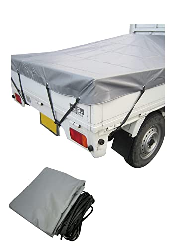 平張り・スロープ張りの両用が可能、しっかり張れる補強加工済み、軽トラック用荷台シート。取り付けに便利な付属ゴムバンド付き。裏地は雨に強いPVC素材を使用した、防水コーティング。