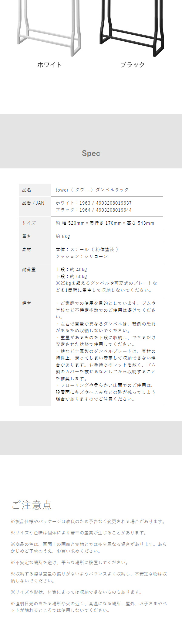 [ ダンベルラック タワー ]山崎実業 tower 耐荷重約90kg 組み立て不要 収納 自宅 フィットネス用品 腹筋ローラー ダンベルプレート トレーニングチューブ ウエイトプレート トレーニング 筋トレ おしゃれ yamazaki 公式 黒 ブラック ホワイト 1963 1964