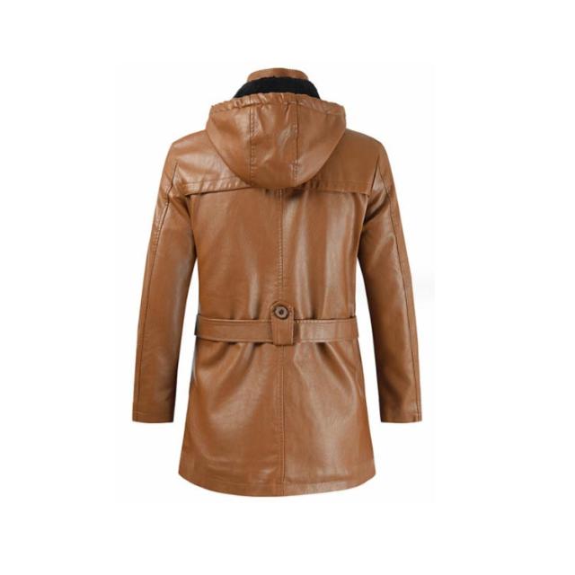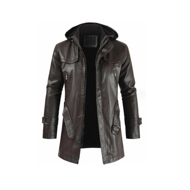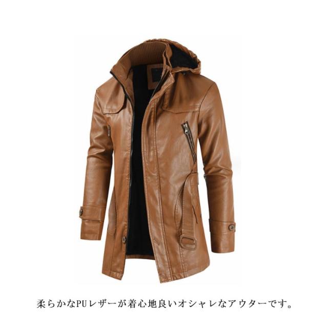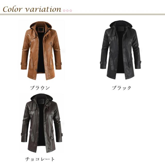 メンズ 防風 ロングコート 合皮 アウター 防寒 メンズ PU ライダースジャケット 革ジャン フード付き ベルト付き バイクウエア ミドル丈 春 秋