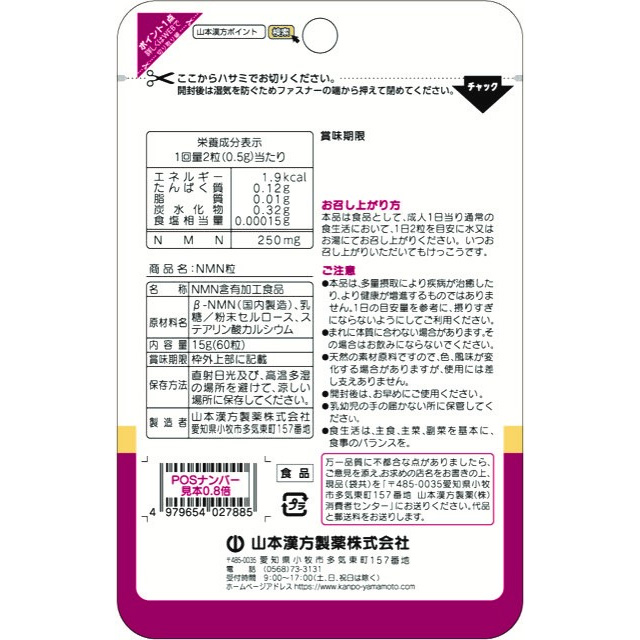 商品名 山本漢方製薬 NMN粒 60錠 容量 15g(60粒) 原材料名 βーNMN(国内製造)、乳糖/粉末セルロース、ステアリン酸カルシウム アレルギー特定原材料 乳成分 生産国 日本 賞味期限 商品の発送時点で、360日以上あるものをお届けいたします 保存方法 常温 お召し上がり方 本品は食品として、成人1日当り通常の食生活において、1日2粒を目安に水又はお湯にてお召し上がりください。
