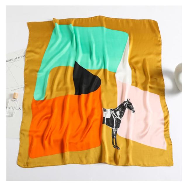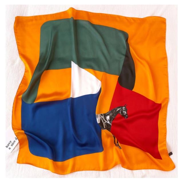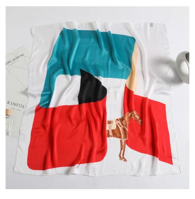 | 正方形の万能スカーフ。 辺約90cmの大判サイズなので、ストールやベルトがわりにしてみたり、バッグに結んだり、アレンジ自由自在でオシャレの幅が広がります。 ストール・ショールのようにも使えます。 シルクタッチのある滑らかな生地です。 | |