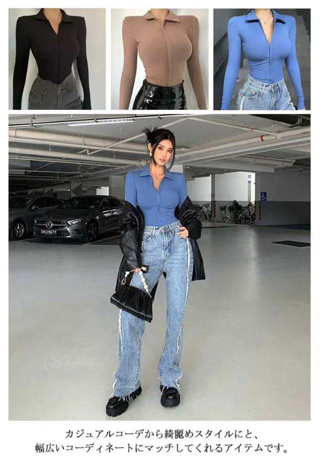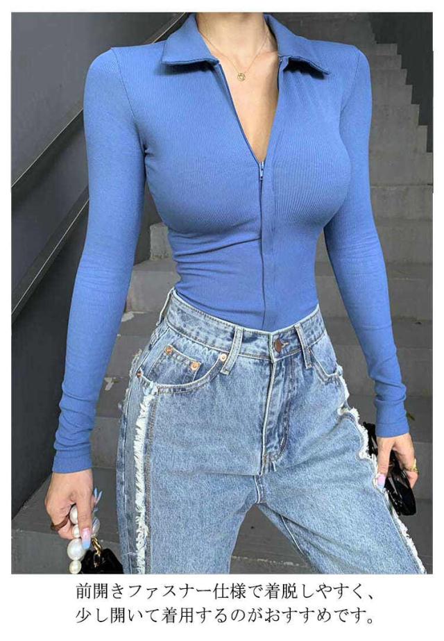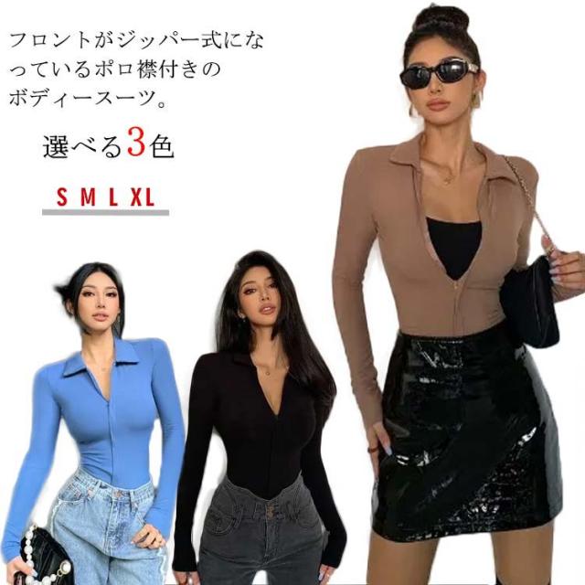 ボディースーツ ボディブリファー レディース 長袖 ポロシャツ リブニット カットソー オールインワン レオタード 前開き ファスナー つなぎ インナー 下着 タイト 肌着 ストレッチ アンダーウェア 細身 無地 シンプル セクシー おしゃれ 秋 春 冬 送料無料