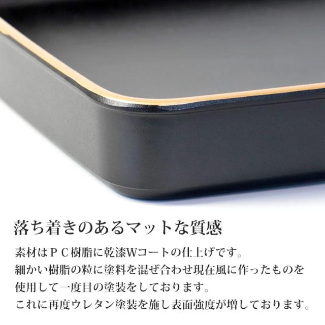 素材はPC樹脂に乾漆Wコートの仕上げです。紀州塗り 賞状盆 A3サイズ 48.7cm PC 16寸 乾漆仕上げ つや消し 日本製 国産 お盆 トレー マット 金縁 賞状 表彰状 表彰盆 表彰式 卒業式 卒園式 学校 入学式 式典用品 催事 祭事 行事 記念式典 イベント セレモニー
