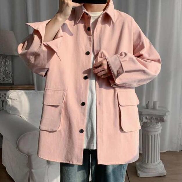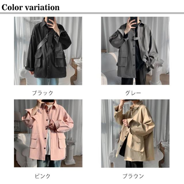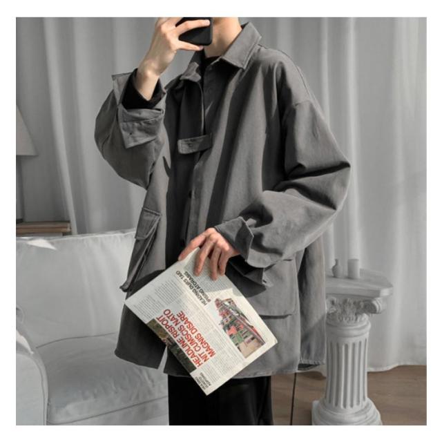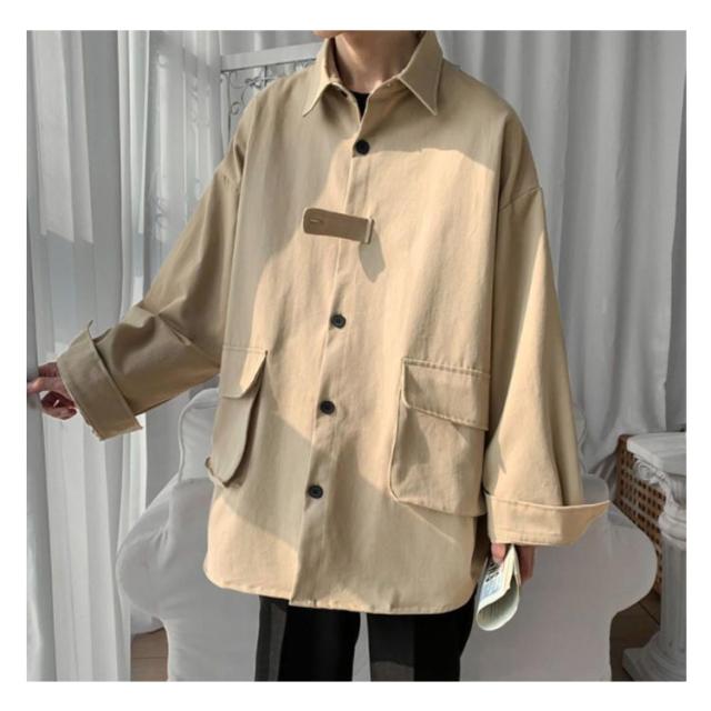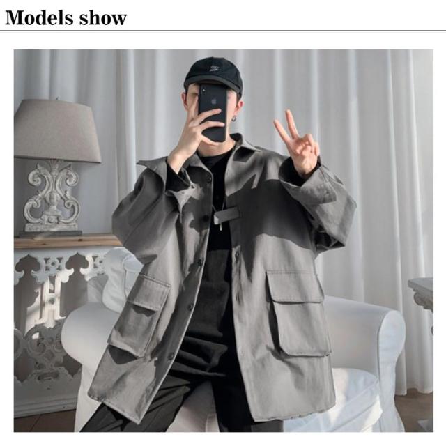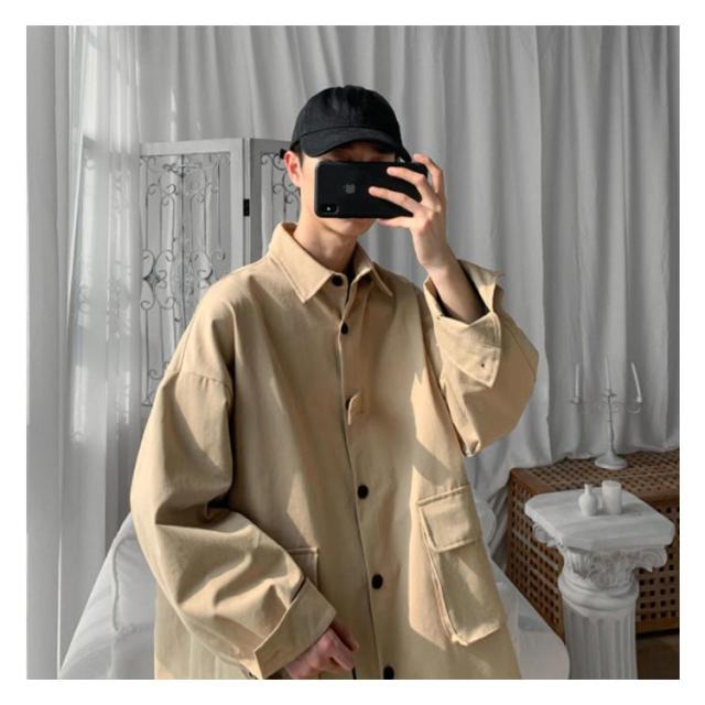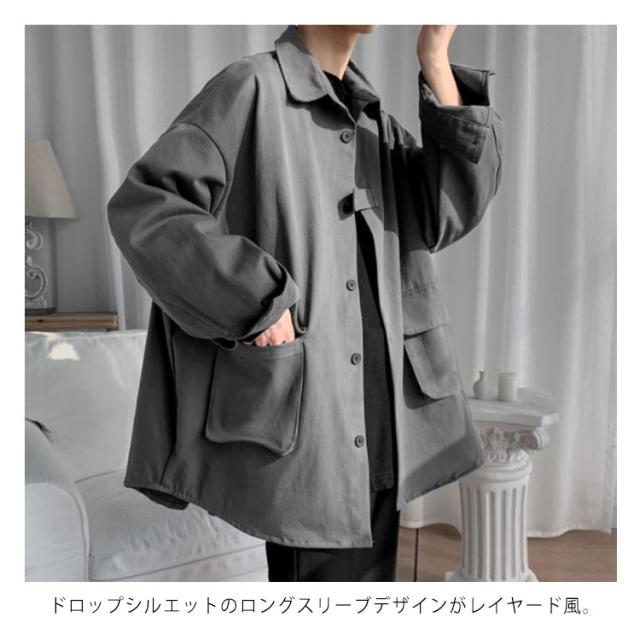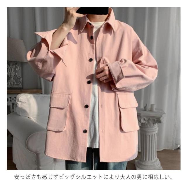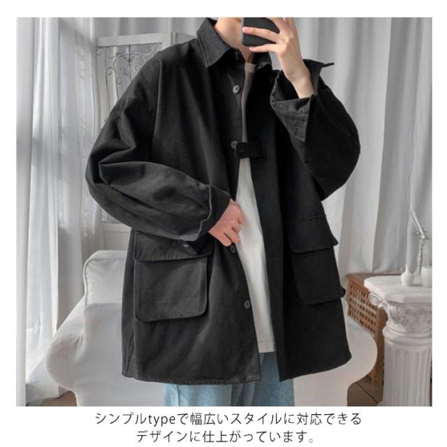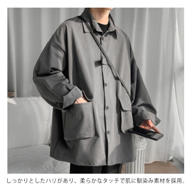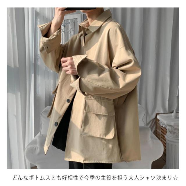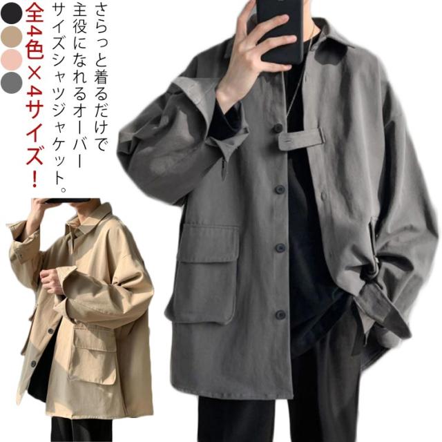 春秋に大人気!シャツジャケット メンズ ロングシャツ 長袖 カジュアルシャツ シャツ ジャケット アウター 大きサイズ ゆったり 羽織り 無地 大きめポケット 折り襟 春服 秋服 通勤 通学