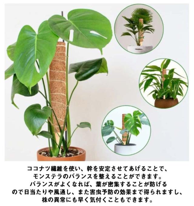 | 植物の成長に合わせて上に継ぎ足していけます。モンステラが盛んに成長しますので太くて長い支柱が必要です。上継ぎ足せば、植物をお好みの高さまで育てることができますので、成長ももっと楽しめます。 天然のココナツ繊維が原材料になり、自然になじみやすくて見栄えが良いです。 木の棒が土に入れやすく、植物に害なく、環境に優しい素材を採用しております。太くて耐久性が良くて、植物を強力に支え、倒れることを防げます。 繊維部に植物が巻き付きやすくなりますので水分も吸収しやすくなります。ココナツ繊維を使い、幹を安定させてあげることで、モンステラのバランスを整えることができます。バランスがよくなれば、葉が密集することが防げるので日当たりや風通し、また害虫予防の効果まで得られますし、株の異常にも早く気付くこともできます。 | |