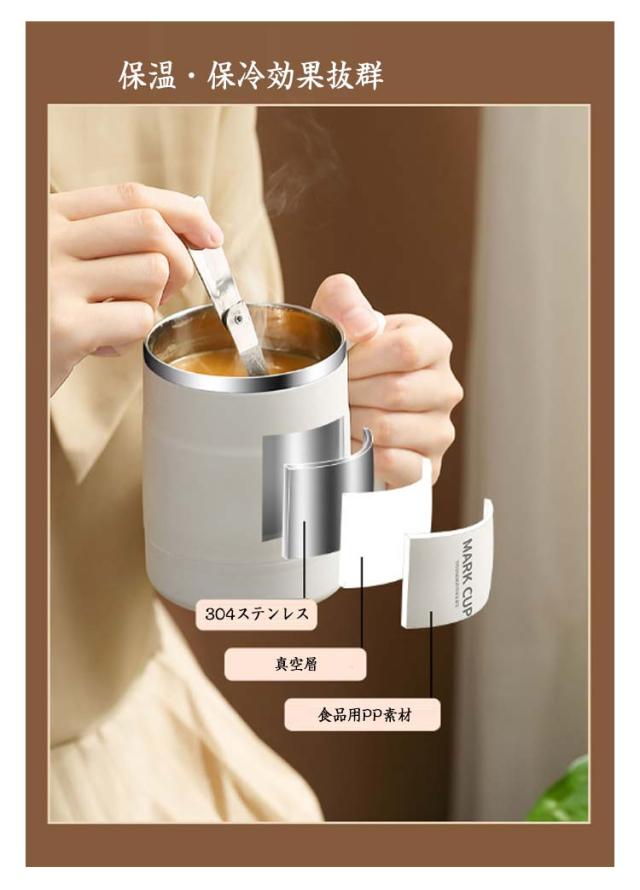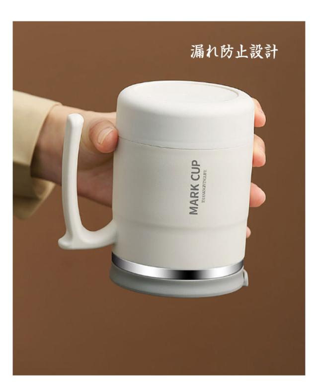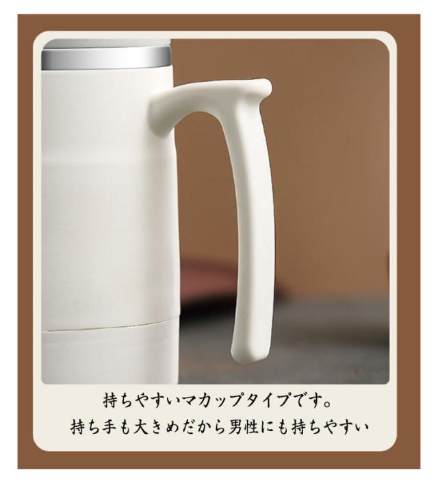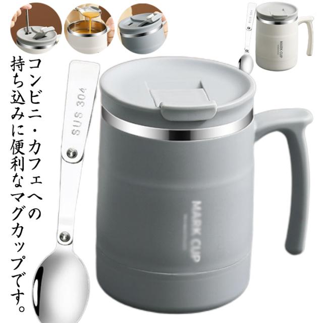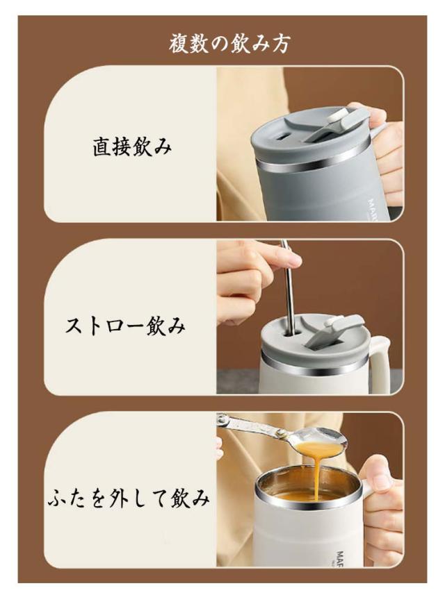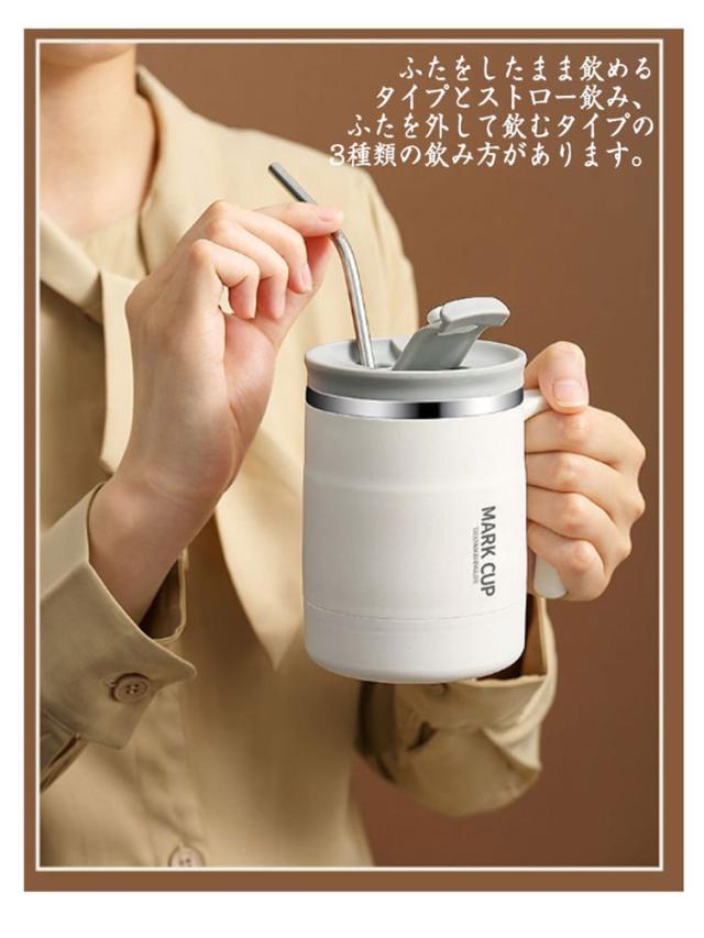 | コンビニ・カフェへの持ち込みに便利なマグカップです。 真空断熱構造で、外からの熱を伝えず、保温・保冷効果が長く続きます。 ふた付きなので、ごみやほこりが入るのを防ぎます。 ふたをしたまま飲めるタイプとストロー飲み、ふたを外して飲むタイプの3種類の飲み方があります。 持ちやすいマカップタイプです。 底面にはすべり止めがついています。 | |