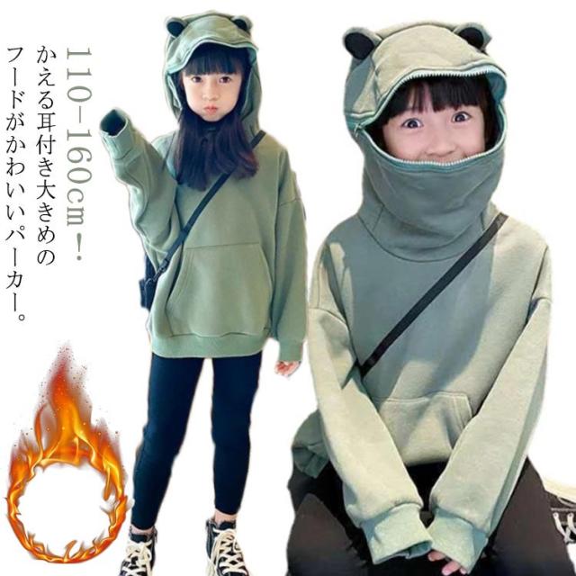 パーカー カエルモチーフ かえる柄 子供服 キッズ 女の子 男の子 裏起毛 パーカー 長袖 プルオーバー トップス フード付き 萌え 動物 蛙モチーフ 子供服 子ども服 ゆったり スウェット パーカー ユニセックス トレーナー カジュアル 大きいサイズ 送料無料 小学生 お揃い