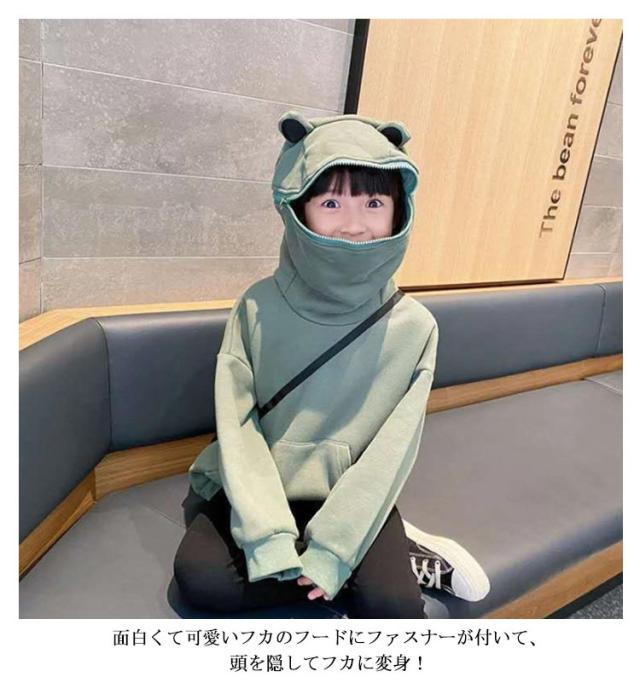 | 110-160cm!かえる耳付き大きめのフードがかわいいパーカー。 裏起毛で暖かく、軽アウターとしても活躍するアイテム。 柔らかく、肌触りの良い素材感も魅力です。 面白くて可愛いフカのフードにファスナーが付いて、頭を隠してフカに変身! | |