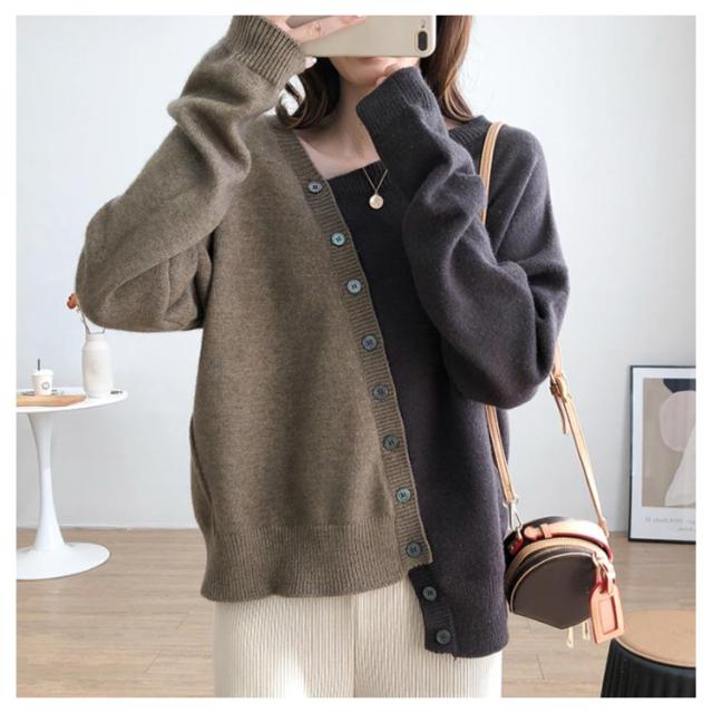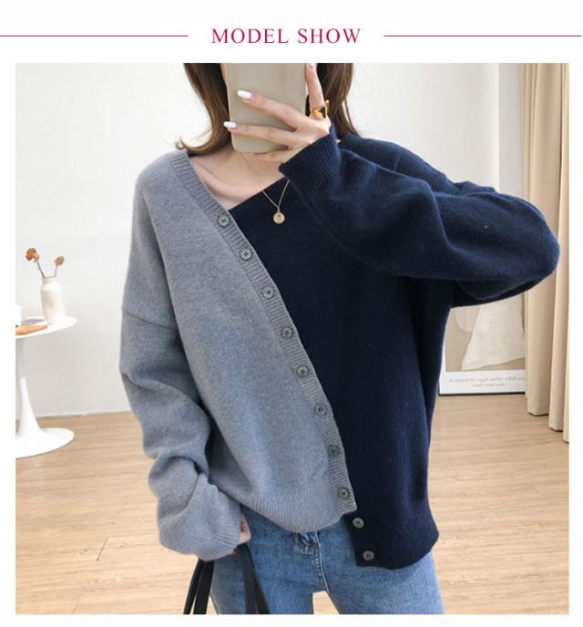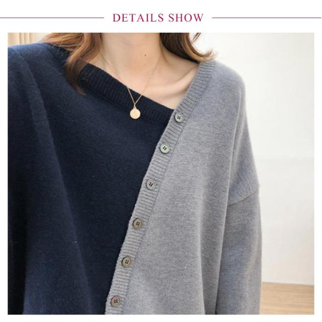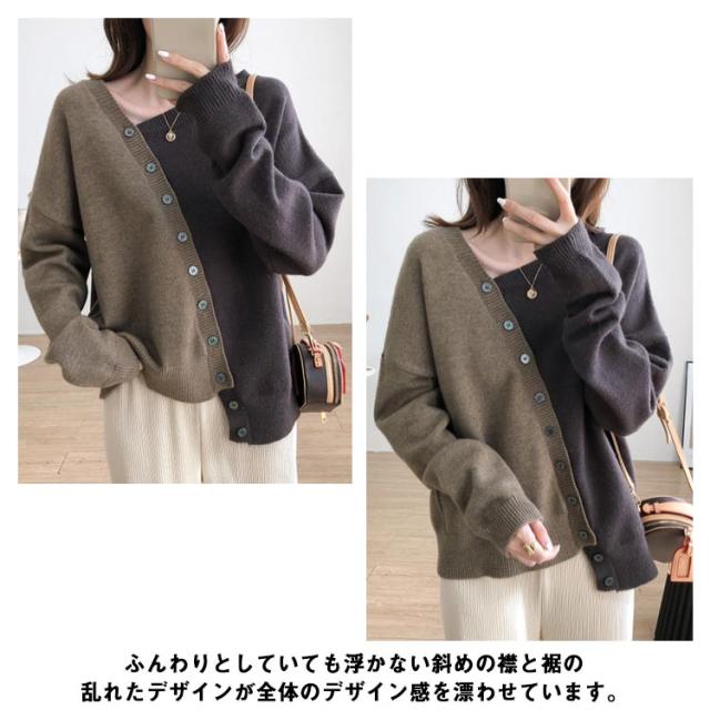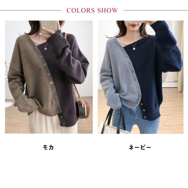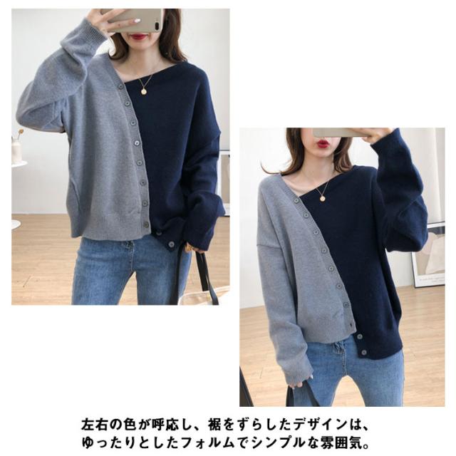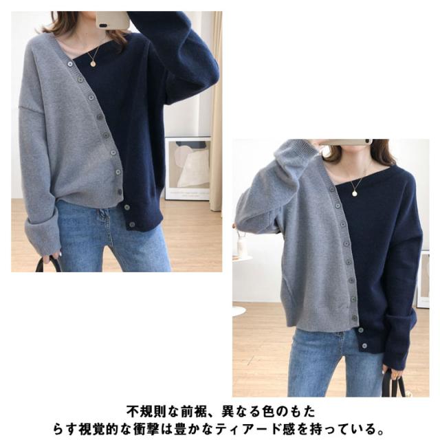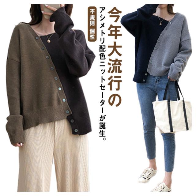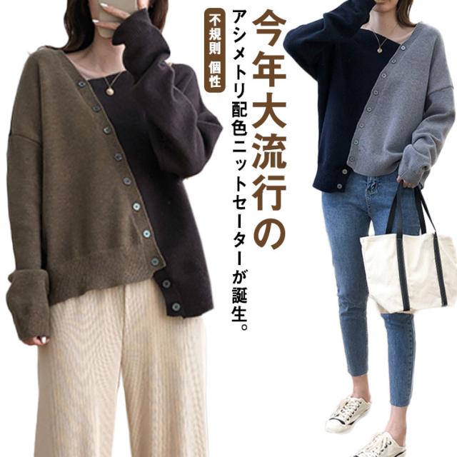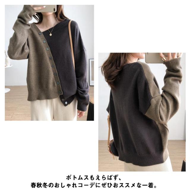 アシメトリーセーター 不規則 ニット セーター 送料無料 レディース プルオーバー ニットトップス ボタン飾り アシメトリー ニットソー 斜め襟 配色 おしゃれ 個性 春 秋 冬 ゆったり
