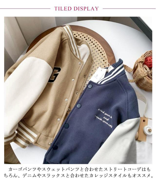 | 寒い季節に大活躍な裏起毛のスタジアムジャケットが登場です。 カーゴパンツやスウェットパンツと合わせたストリートコーデはもちろん、デニムやスラックスと合わせたカレッジスタイルもオススメ。 前あきボタン仕様なのでお子様一人でも着脱できます。 ユニセックスで着用できるデザインで、兄弟・姉妹のお揃いも楽しめる1枚です。 | |
