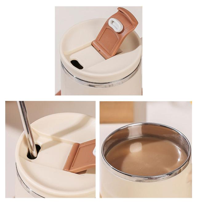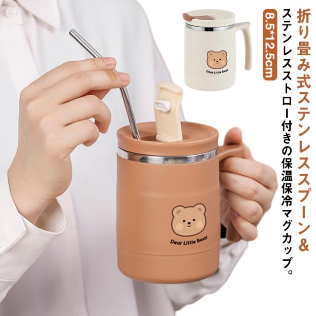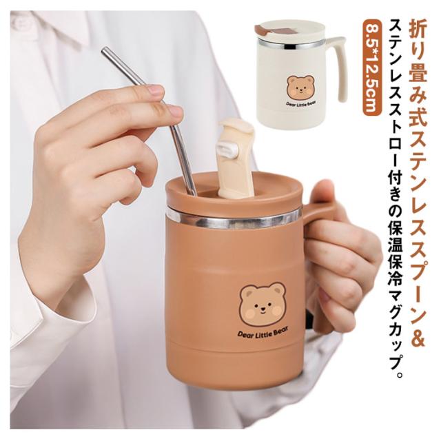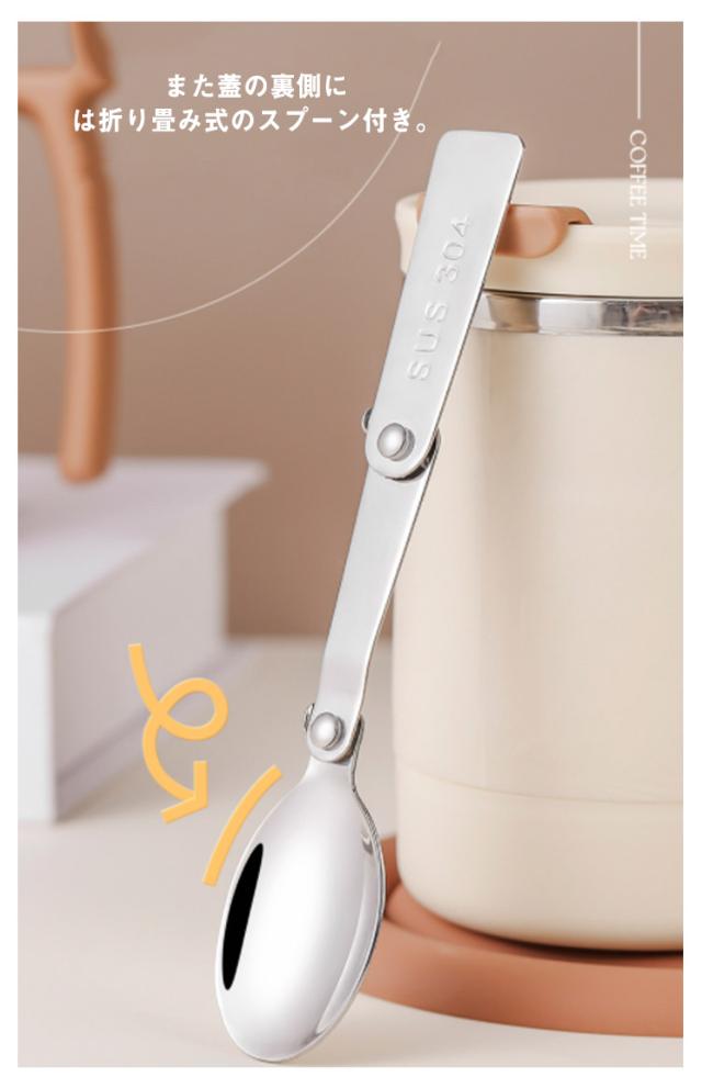 | 折り畳み式ステンレススプーン&ステンレスストロー付きの保温保冷マグカップ。 カップ本体には食器などに使われている耐久性・耐錆性に優れたステンレスを採用しているためお手入れも簡単 飲み口にフラップ式のフタがついているのでこぼれにくくなっています。 直飲みはもちろん、付属のストローを使うことでお気に入りのブレンドドリンクもたのしめます。 また蓋の裏側には折り畳み式のスプーン付き。 本体は真空断熱構造で保温、保冷OKです。 家ではもちろん、オフィスやアウトドアにもお使い頂けます。 これからの寒い時期に、コーヒーやティーを飲むのに活躍すること間違いなしです! | |