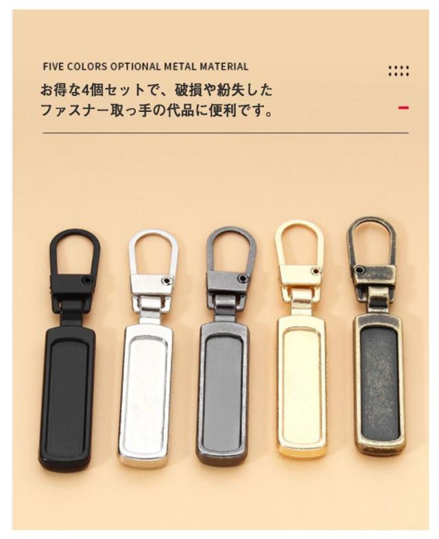 | いろいろなシーンで大活躍!便利なファスナーの引き手。 お得な4個セットで、破損や紛失したファスナー取っ手の代品に便利です。 自動バネ式なのでフックを通して指の爪でカチッと戻すだけで取り付けOK。 小物だけでなく、パーカーなどの洋服やジャージのジッパー・ファスナーにもぜひ! | |