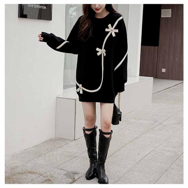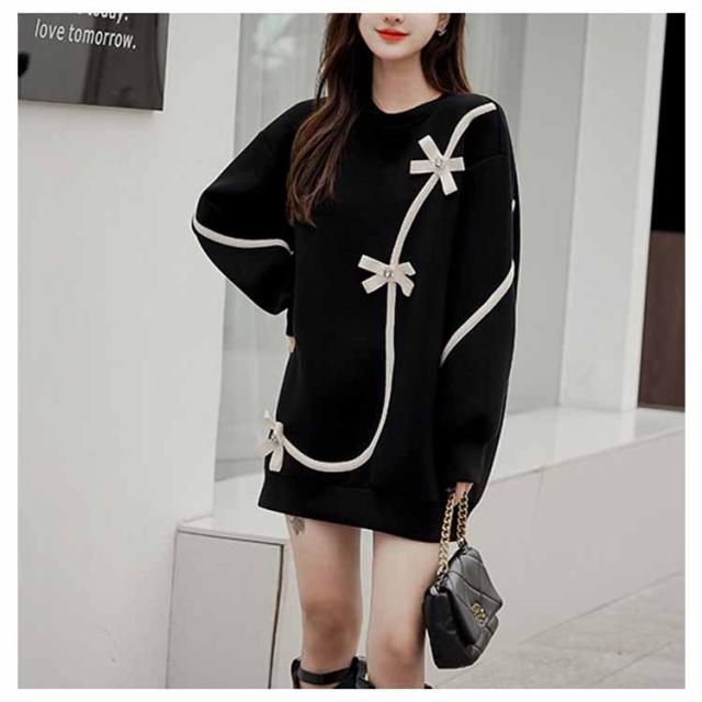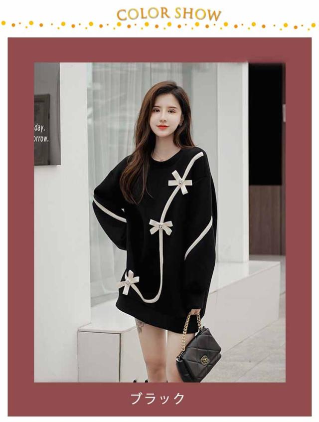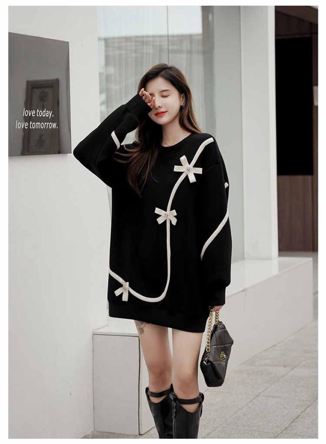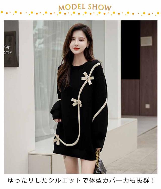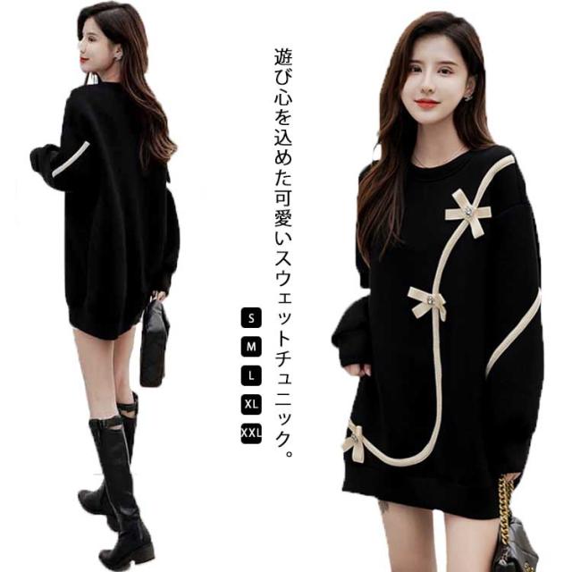 スウェット チュニック ラウンドネック 長袖 レディース 花 お出かけ きれいめ ミニワンピース ショート丈 ロング丈 トレーナー 体型カバー ゆったり 上品 可愛い 食事会 休日 ストリート 20代30代40代