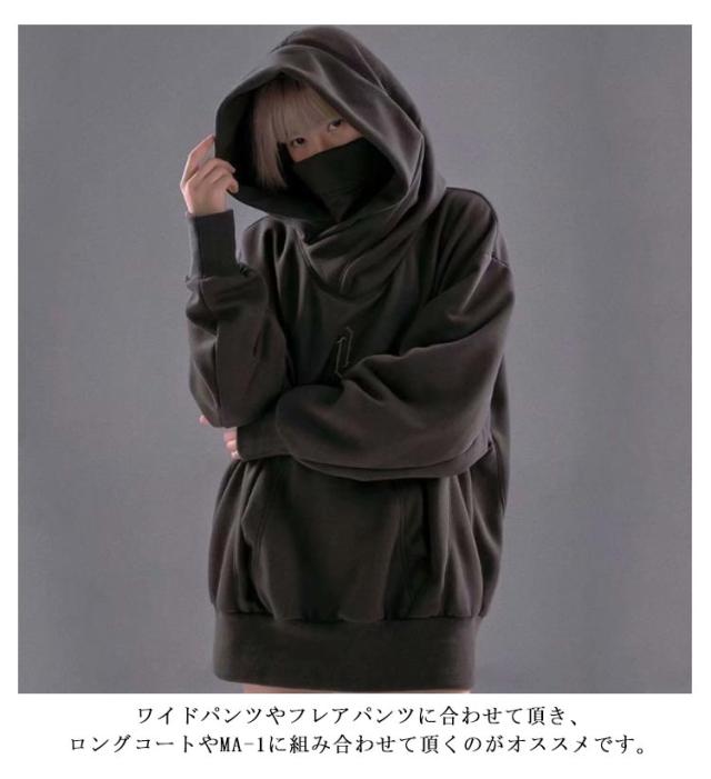 ボリュームネック パーカー メンズ レディース 長袖 春秋 ハイネックパーカー フード付きボリュームネックパーカー カットソー スウェット スエット オーバーサイズ タートルネック ハイネック 無地 ゆったり ストリート系 お兄系 個性的 モード系 原宿風
