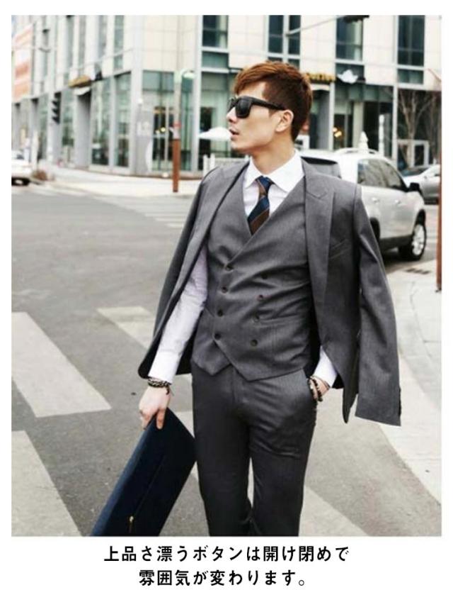 | ダブルボタンデザインの細身ベスト! 全体のラインがとてもキレイでスマートな印象に。 上品さ漂うボタンは開け閉めで雰囲気が変わります。 ワイシャツ、ジャケットと合わせてフォーマルに、Tシャツ等と合わせてカジュアルにスタイルに合わせて様々な着こなしが出来る定番アイテムです。 ビジネス、結婚式などのフォーマルシーンにもおすすめです。 | |