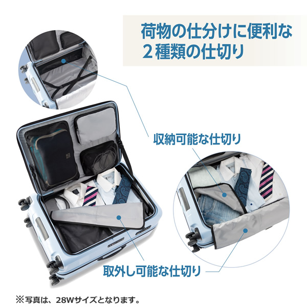 荷物の仕分けに便利な2種類の仕切りは、収納可能な仕切り、取り外し可能な仕切りをそれぞれ1枚ずつご用意しています。