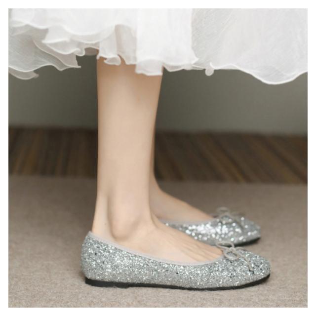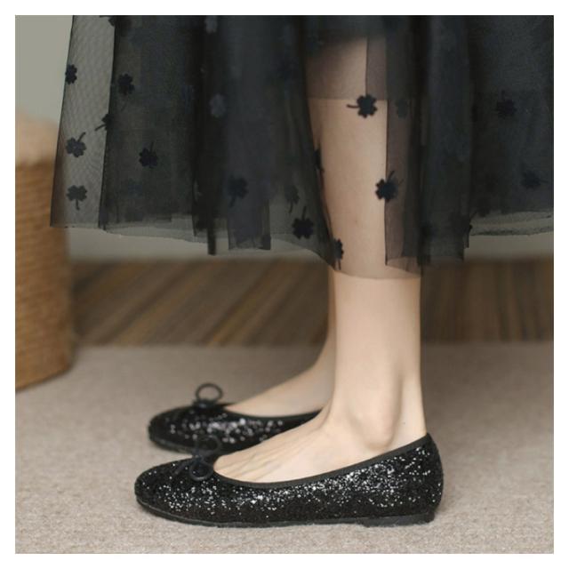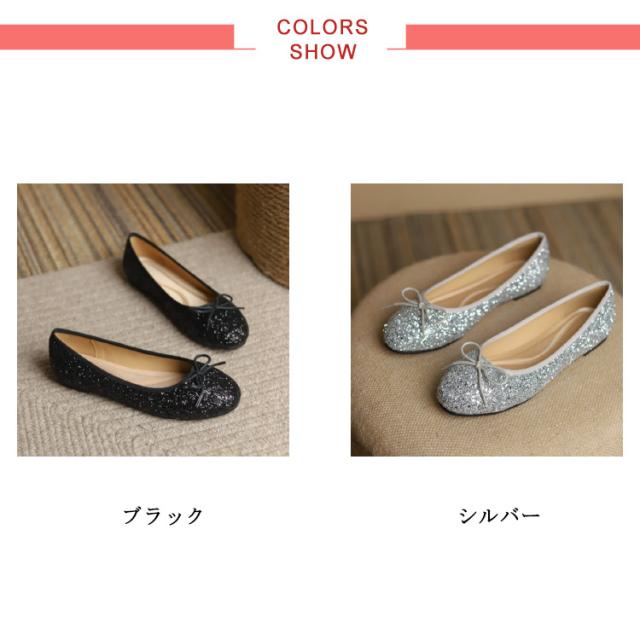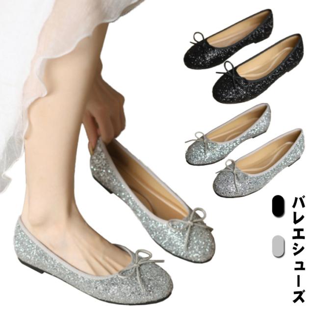 パンプス ローヒール キラキラ 痛くない 柔らかい スクエアトゥ フラット バレエシューズ レディース グリッター フラットシューズ リボン ぺたんこ パンプス 歩きやすい パーティー 黒 ブラック シルバー