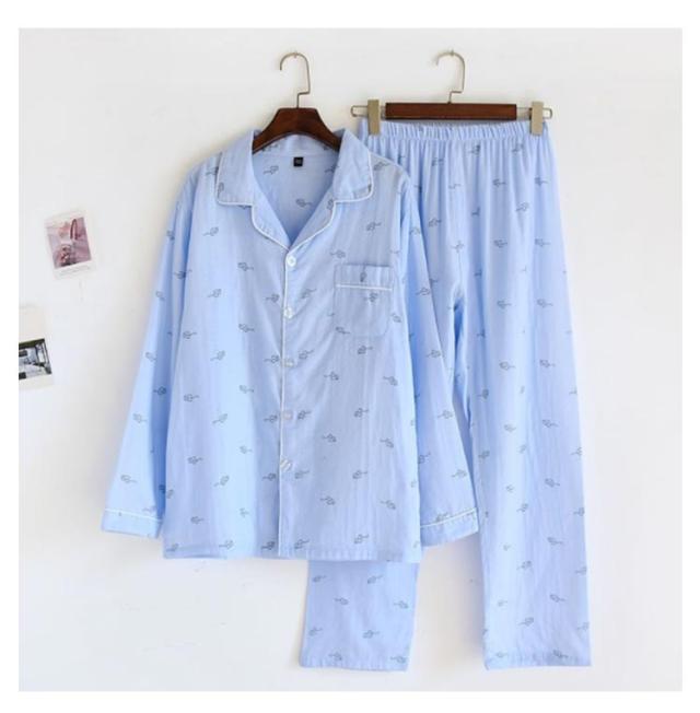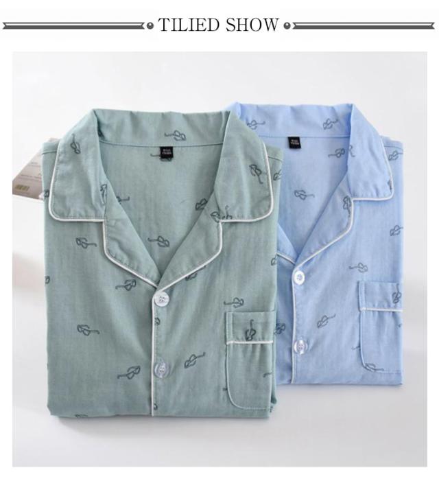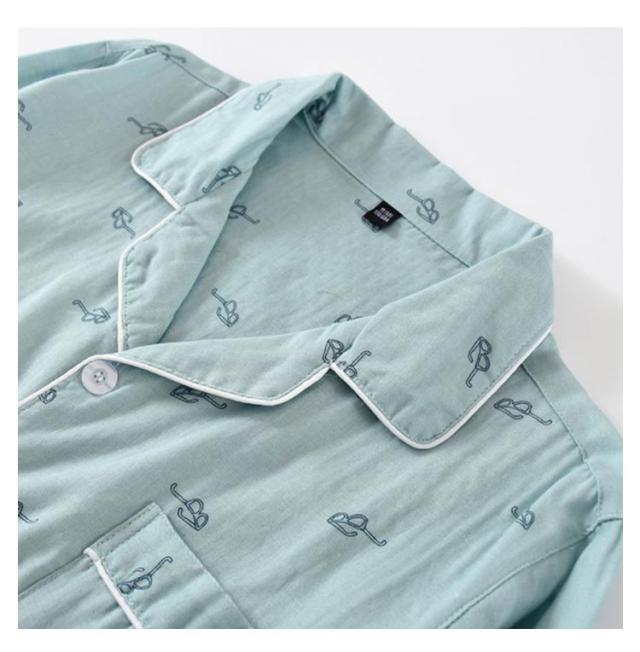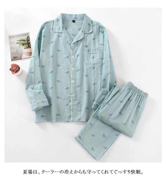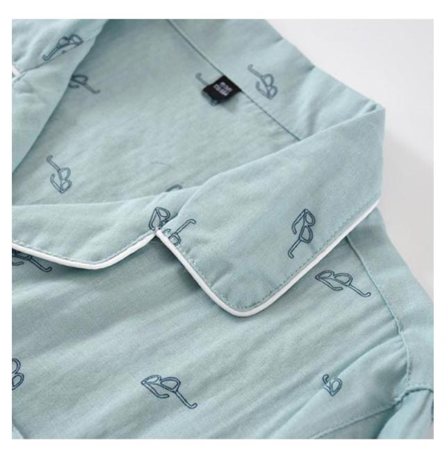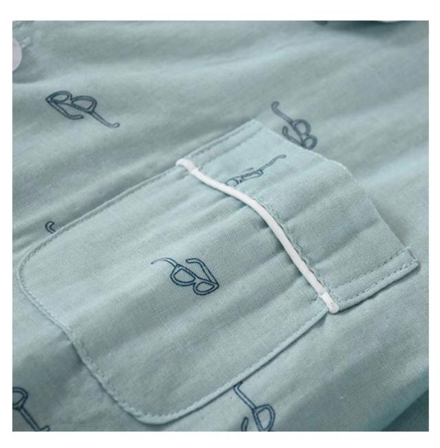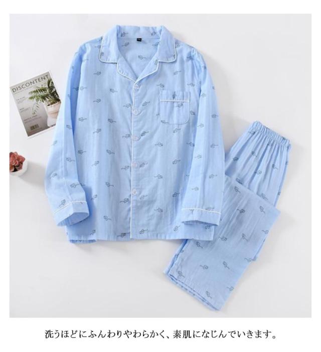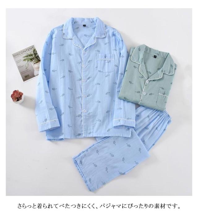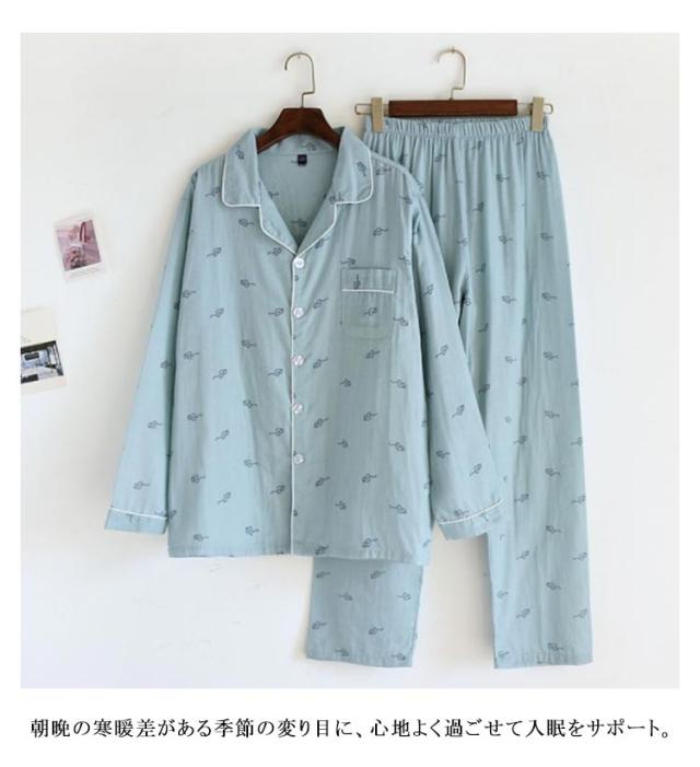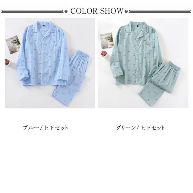 パジャマ 上下セット セットアップ メンズ 綿 二重ガーゼ ルームウェア 寝間着 部屋着 長袖 前開き フロントボタン 胸ポケット ウェストゴム 総柄 メガネ柄 春 夏 全2色