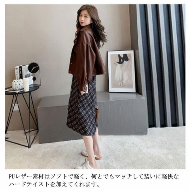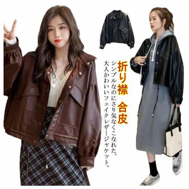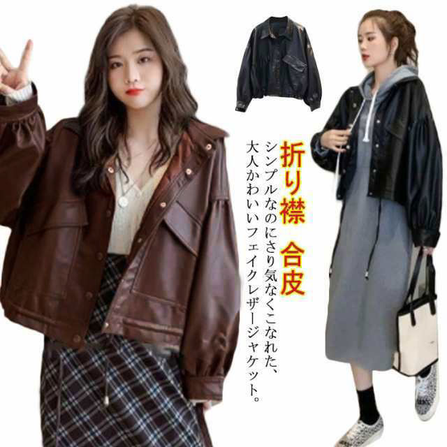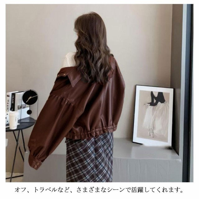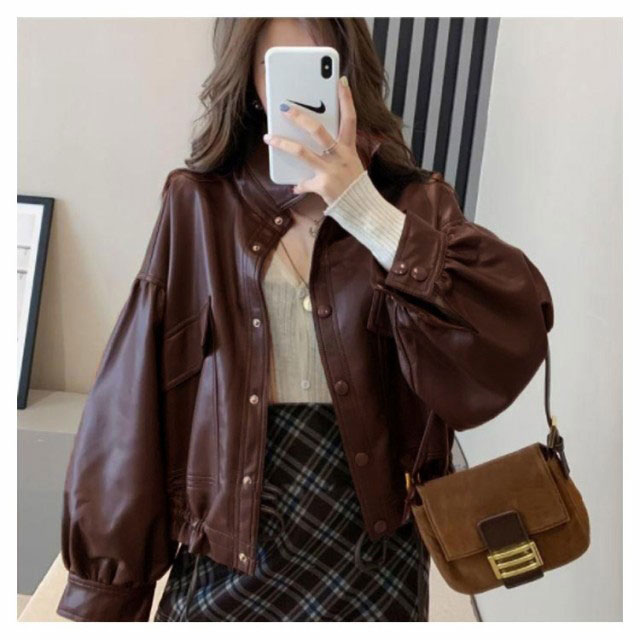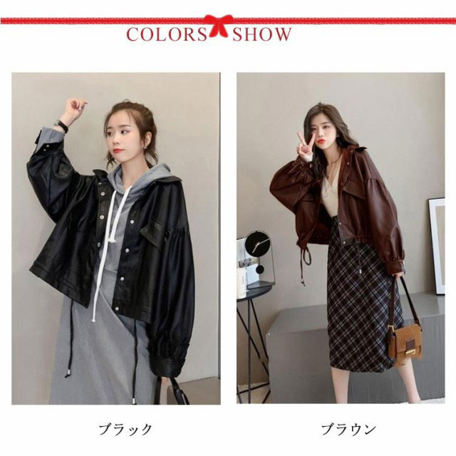 レザージャケット レディース バルーン袖 春コーデ 折り襟 ショート丈 ライトアウター カジュアル かわいい フェイクレザー ジャケット 合皮 キレイめ ブラック ブラウン 春 秋 カジュアル S M L XL