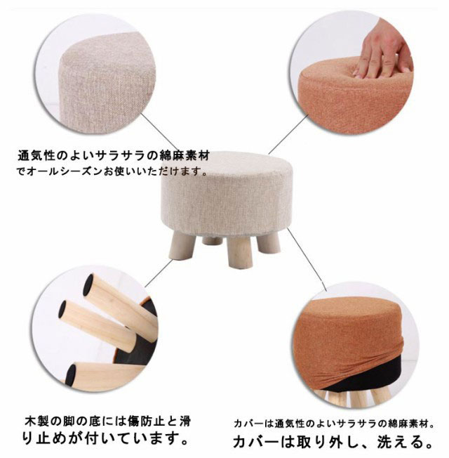 | リビングや寝室、玄関にちょこんと置いて使える♪木製スツール。 木製脚と布張りの小さいイスは、ソファに座ってくつろぐ際のオットマン(足置きいす)がわりにもなる1人掛けロースツールです。 木製の脚の底には傷防止と滑り止めが付いています。 通気性のよいサラサラの綿麻素材でオールシーズンお使いいただけます。 カバーは通気性のよいサラサラの綿麻素材。カバーは取り外し、洗える。 ナチュラルな雰囲気の円型スツール。 | |