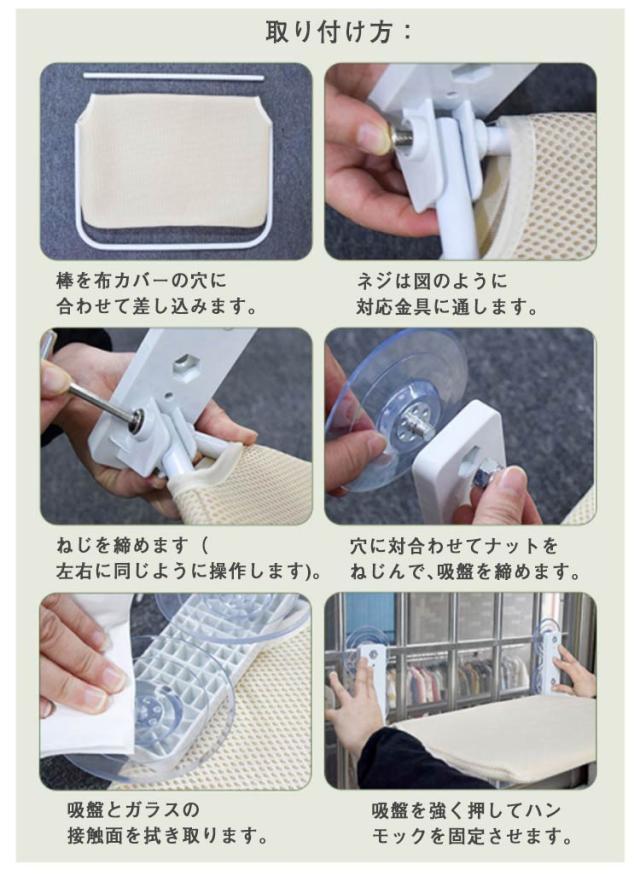 | 吸盤タイプ式猫窓用ハンモック、調節簡単でどこでも自由に設置可能です。 使わないときは折りたたんで収納できるので、場所を取らず、カーテンの邪魔になりません。 マット部分は外して水洗い可能なので、汚れたら,簡単に洗濯でき、いつでも清潔を保てる。 窓ガラスに強力吸盤をぴたっと貼り付けるだけで簡単に組み立てできます。 外出ができない猫ちゃんにも街の景色を眺める、暖かい日光に浴びてゆっくりくつろぎできます。 取り付け方: 棒を布カバーの穴に合わせて差し込みます。 ネジは図のように対応金具に通します。 ねじを締めます(左右に同じように操作します)。 穴に対合わせてナットをねじんで、吸盤を締めます。 吸盤とガラスの接触面を拭き取ります。 吸盤を強く押してハンモックを固定させます。 | |