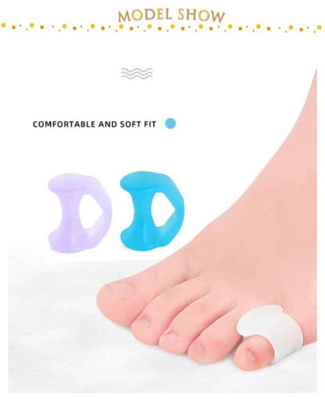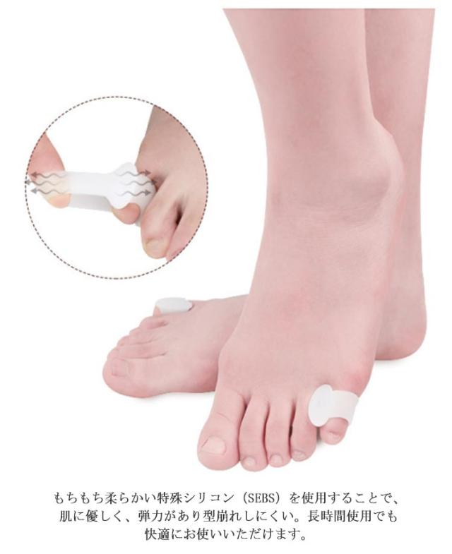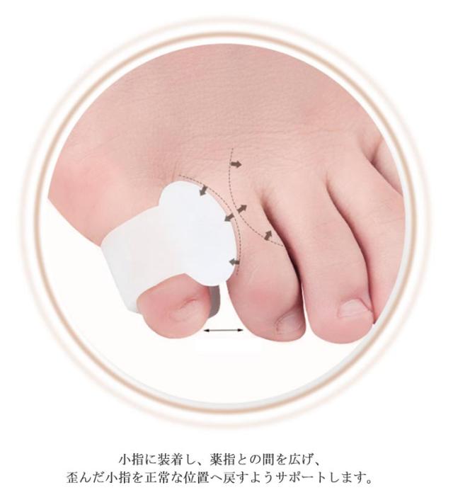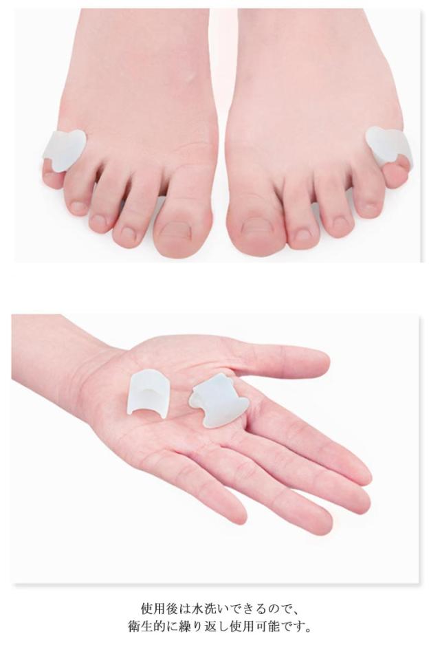 | 内反小趾サポーター。 もちもち柔らかい特殊シリコン(SEBS)を使用することで、肌に優しく、弾力があり型崩れしにくい。長時間使用でも快適にお使いいただけます。 付けるだけで靴に当たって痛かった小指を優しく保護し、歩行時の衝撃を軽減します。 小指に装着し、薬指との間を広げ、歪んだ小指を正常な位置へ戻すようサポートします。 使用後は水洗いできるので、衛生的に繰り返し使用可能です。 | |